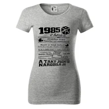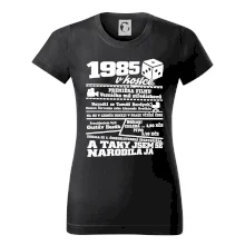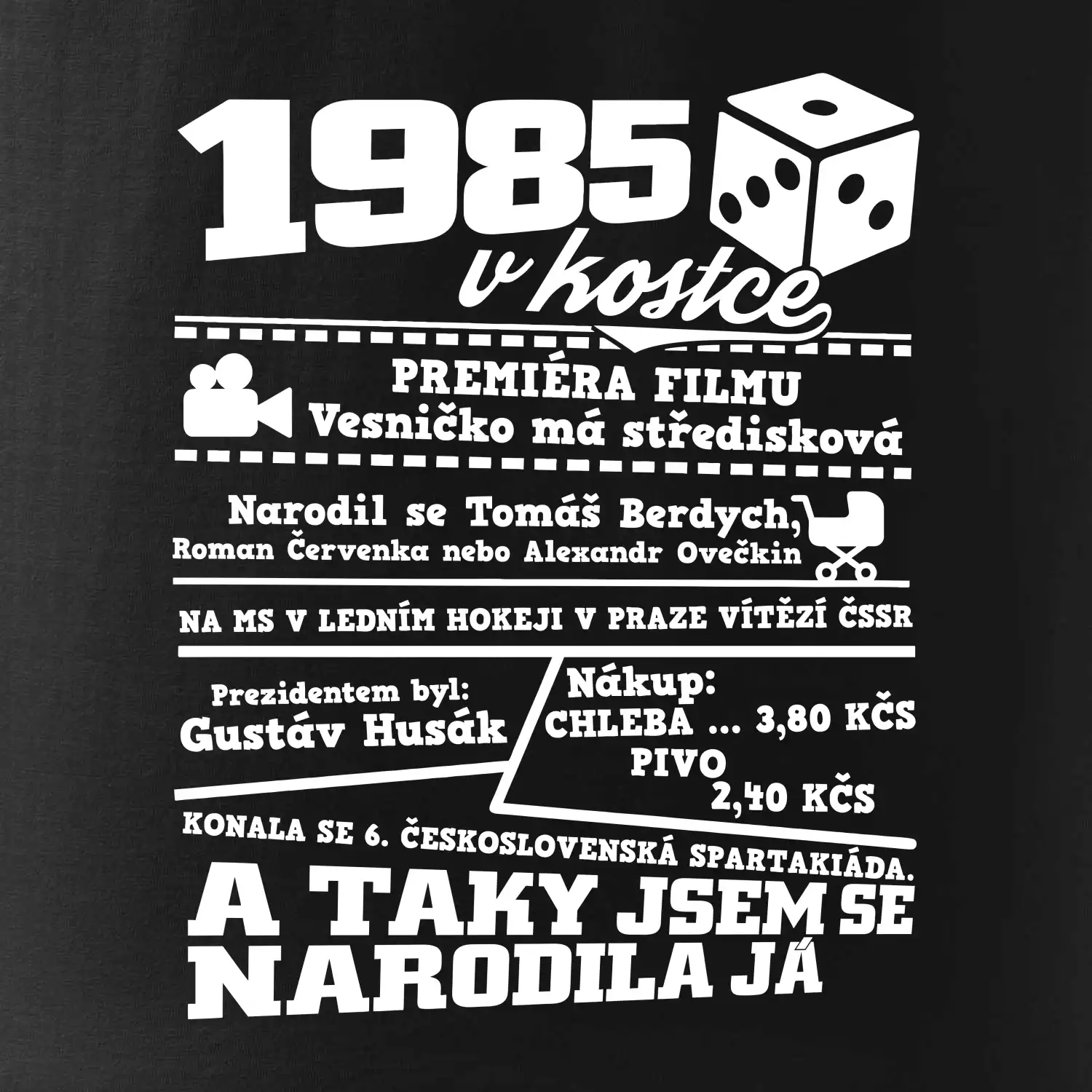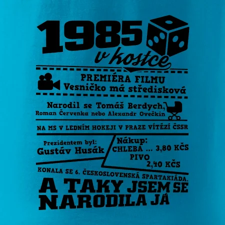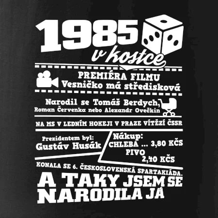 Narozeninové tričko pro ročník 1985. Sháníš originální dárek? Triko pro ročník 1985 v kostce je ten nejlepší dárek, kterým jistě potěšíš. Kolik co stálo? Kdo byl prezident? Kdo se narodil? Všechno tohle a ještě mnohem víc najdeš na našem oslaveneckém triku!