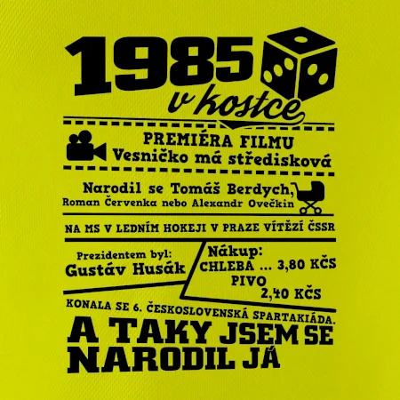 Narozeninové tričko pro ročník 1985. Sháníš originální dárek? Triko pro ročník 1985 v kostce je ten nejlepší dárek, kterým jistě potěšíš. Kolik co stálo? Kdo byl prezident? Kdo se narodil? Všechno tohle a ještě mnohem víc najdeš na našem oslaveneckém triku!