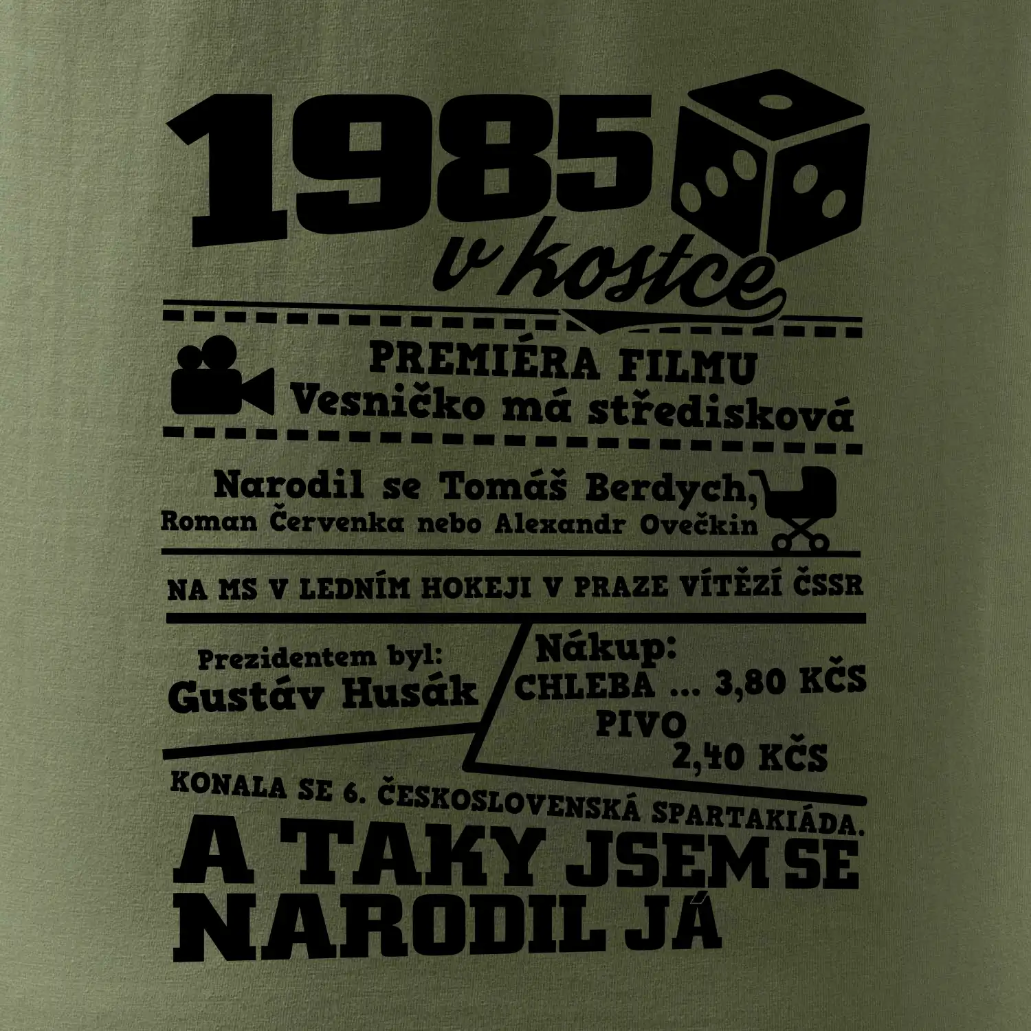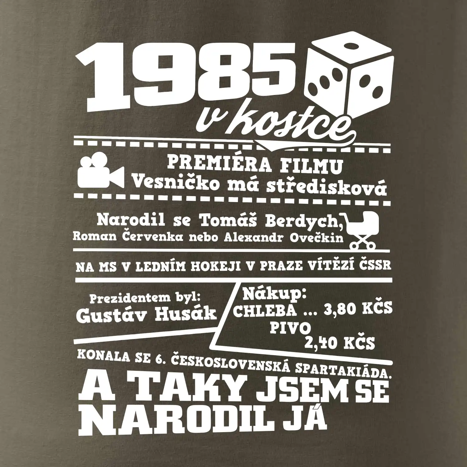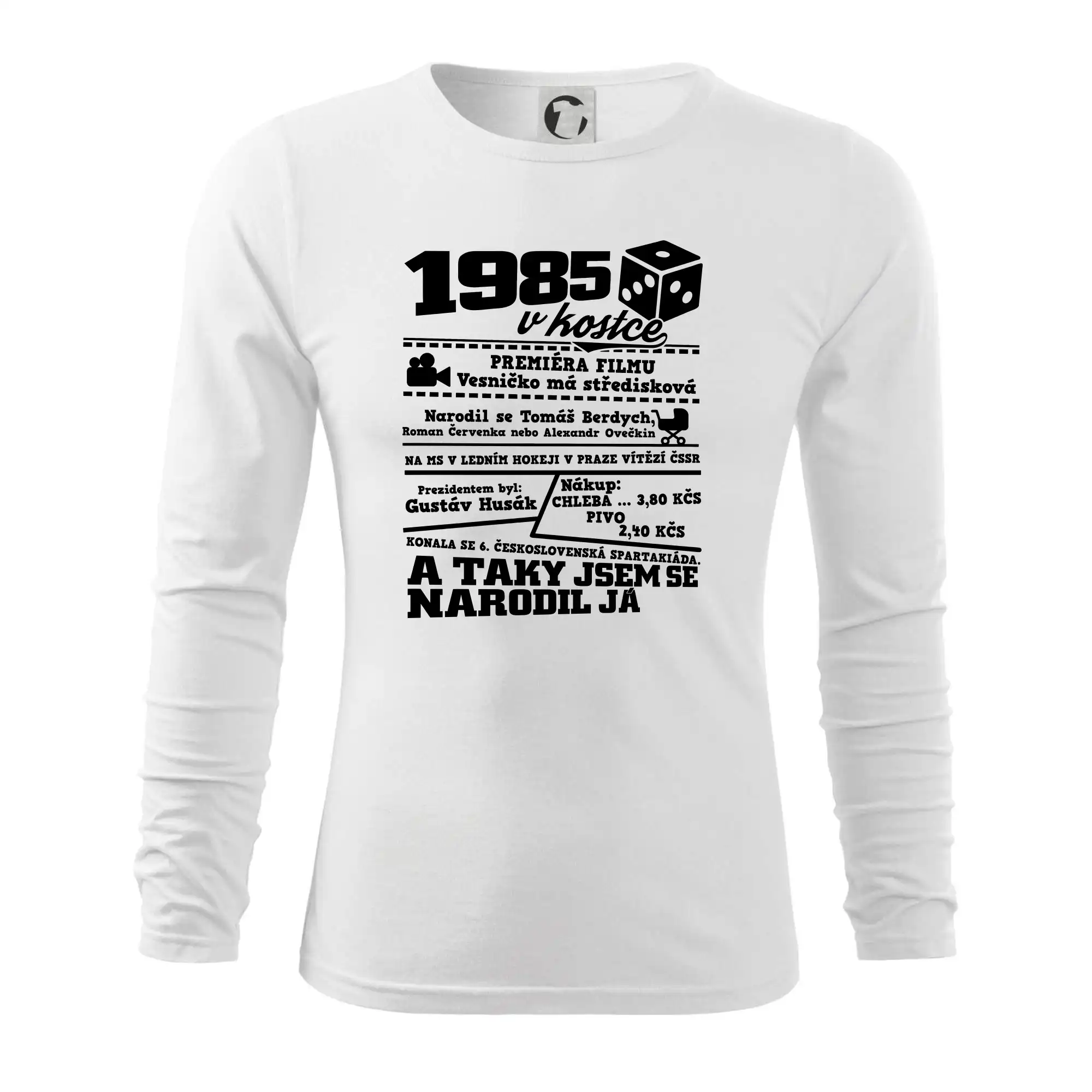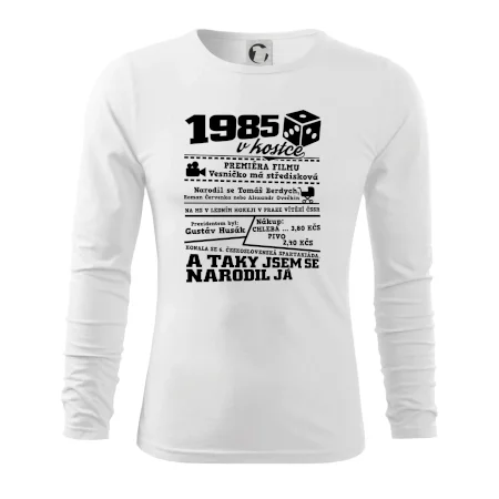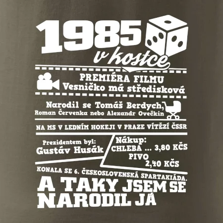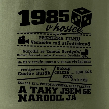 Narozeninové tričko pro ročník 1985. Sháníš originální dárek? Triko pro ročník 1985 v kostce je ten nejlepší dárek, kterým jistě potěšíš. Kolik co stálo? Kdo byl prezident? Kdo se narodil? Všechno tohle a ještě mnohem víc najdeš na našem oslaveneckém triku!