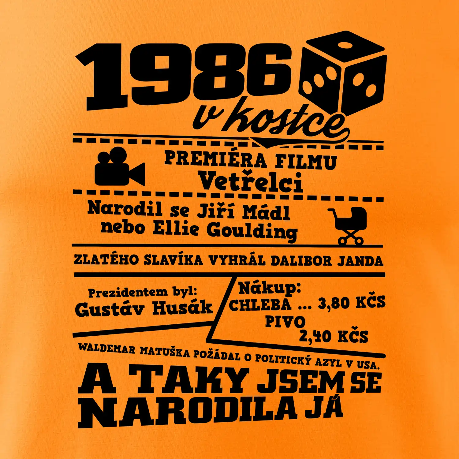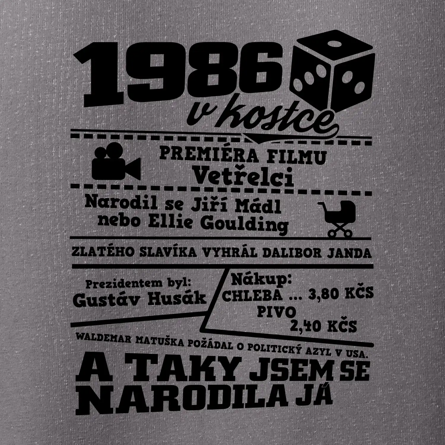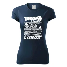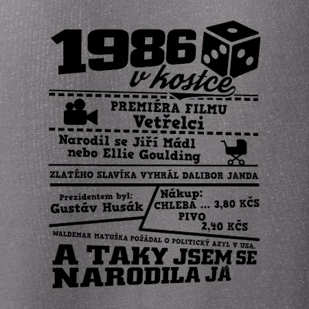 Narozeninové tričko pro ročník 1986. Sháníš originální dárek? Triko pro ročník 1986 v kostce je ten nejlepší dárek, kterým jistě potěšíš. Kolik co stálo? Kdo byl prezident? Kdo se narodil? Všechno tohle a ještě mnohem víc najdeš na našem oslaveneckém triku!