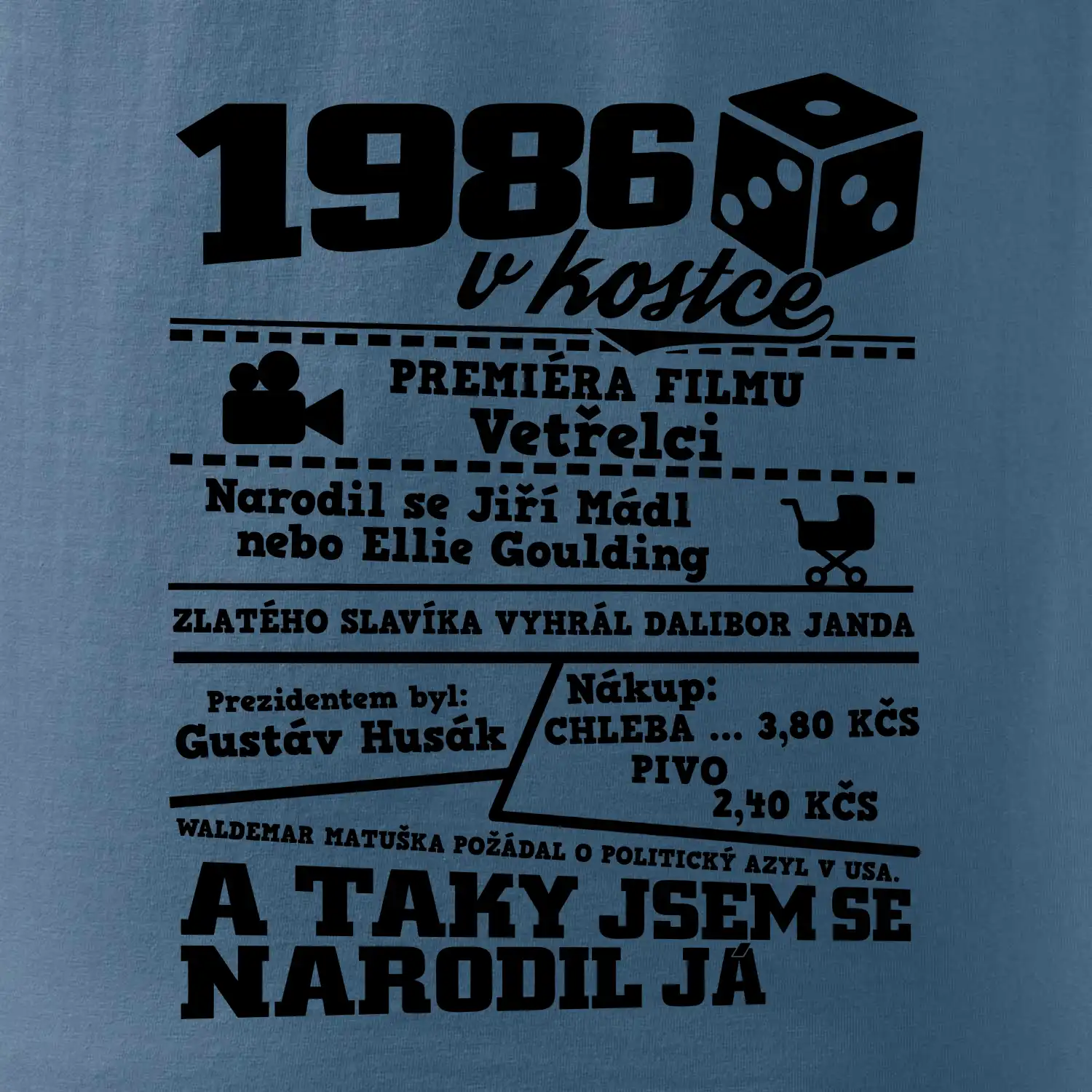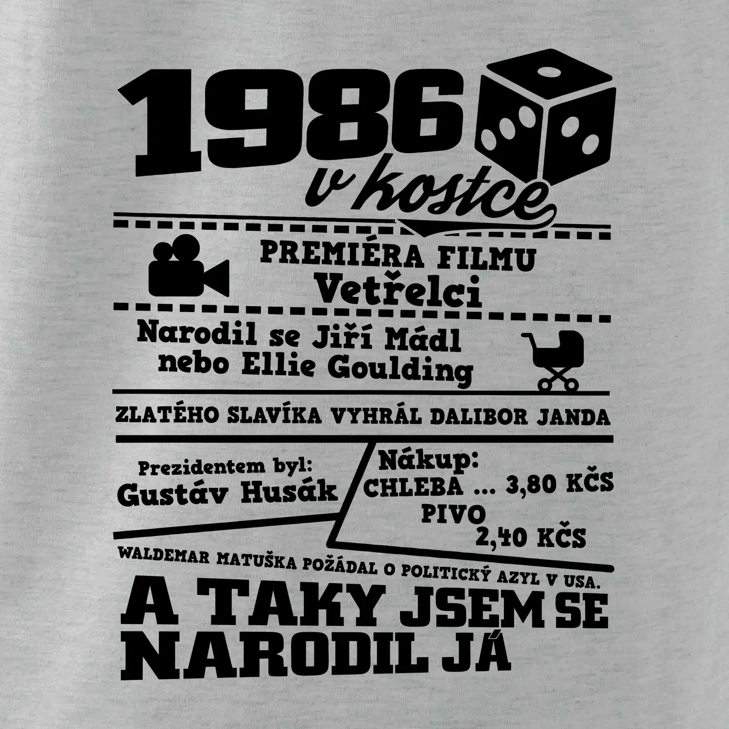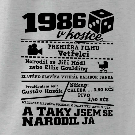 Narozeninové tričko pro ročník 1986. Sháníš originální dárek? Triko pro ročník 1986 v kostce je ten nejlepší dárek, kterým jistě potěšíš. Kolik co stálo? Kdo byl prezident? Kdo se narodil? Všechno tohle a ještě mnohem víc najdeš na našem oslaveneckém triku!