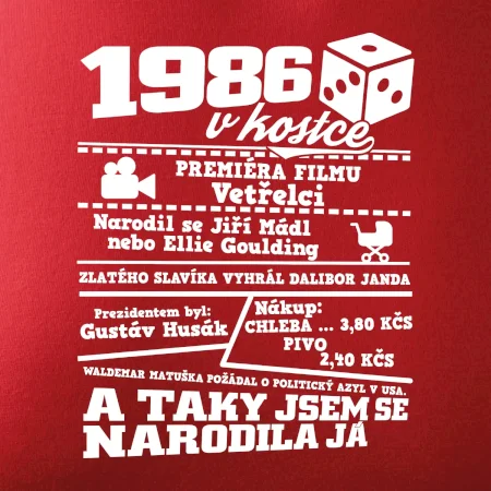 Narozeninové tričko pro ročník 1986. Sháníš originální dárek? Triko pro ročník 1986 v kostce je ten nejlepší dárek, kterým jistě potěšíš. Kolik co stálo? Kdo byl prezident? Kdo se narodil? Všechno tohle a ještě mnohem víc najdeš na našem oslaveneckém triku!