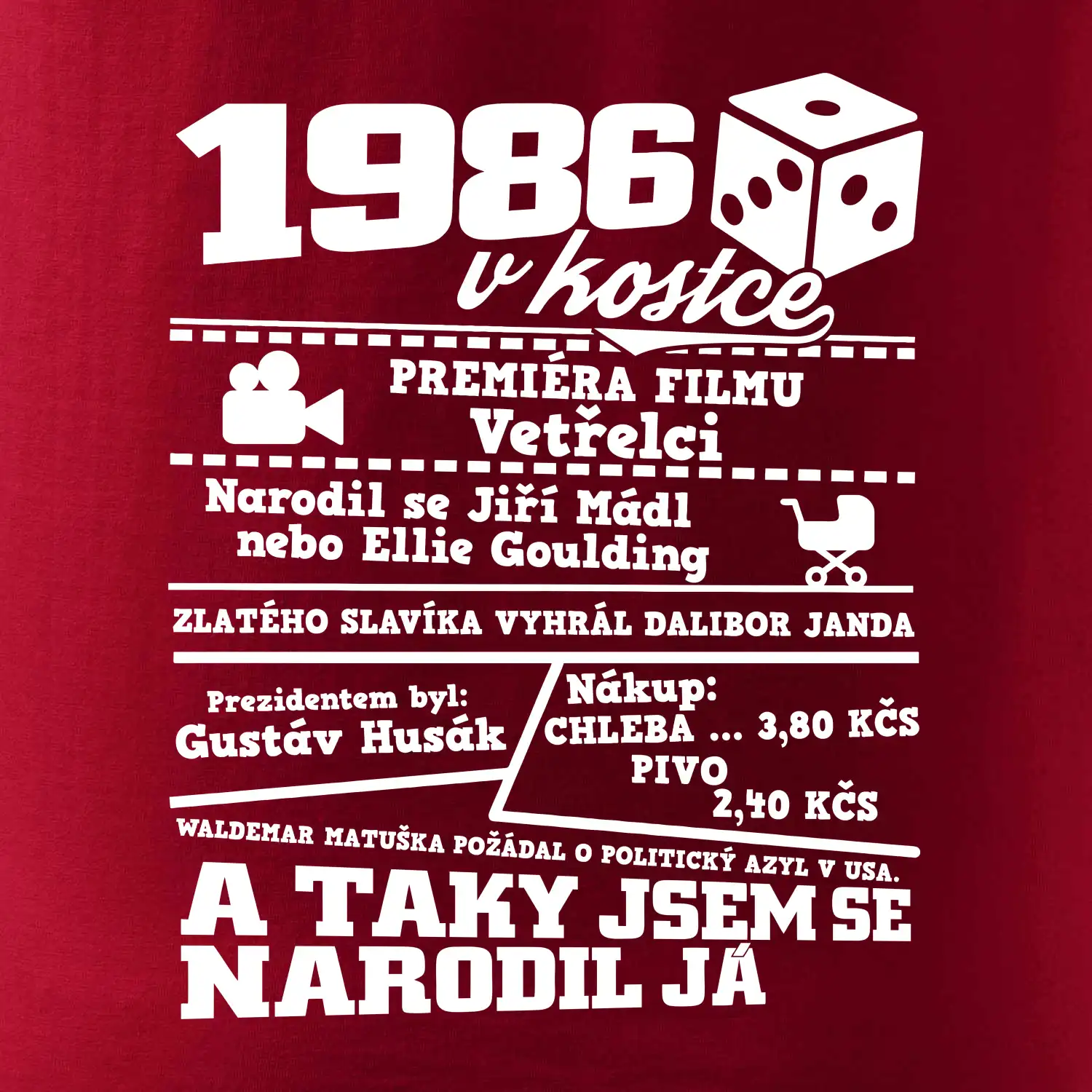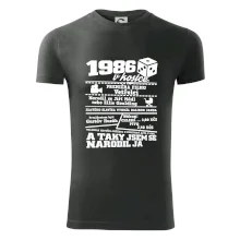 Narozeninové tričko pro ročník 1986. Sháníš originální dárek? Triko pro ročník 1986 v kostce je ten nejlepší dárek, kterým jistě potěšíš. Kolik co stálo? Kdo byl prezident? Kdo se narodil? Všechno tohle a ještě mnohem víc najdeš na našem oslaveneckém triku!