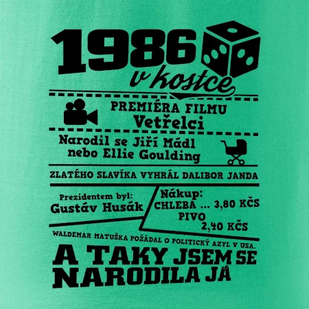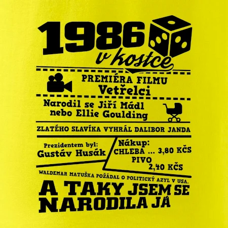Narozeninové tričko pro ročník 1986. Sháníš originální dárek? Triko pro ročník 1986 v kostce je ten nejlepší dárek, kterým jistě potěšíš. Kolik co stálo? Kdo byl prezident? Kdo se narodil? Všechno tohle a ještě mnohem víc najdeš na našem oslaveneckém triku!
