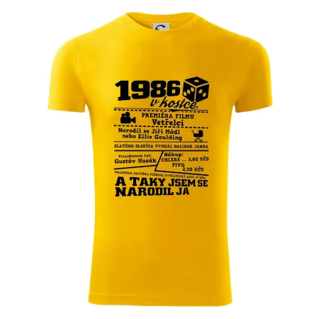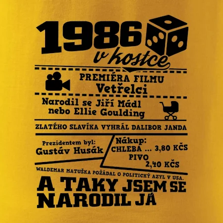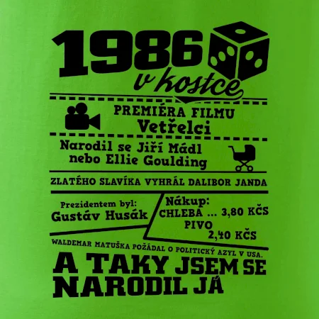 Narozeninové tričko pro ročník 1986. Sháníš originální dárek? Triko pro ročník 1986 v kostce je ten nejlepší dárek, kterým jistě potěšíš. Kolik co stálo? Kdo byl prezident? Kdo se narodil? Všechno tohle a ještě mnohem víc najdeš na našem oslaveneckém triku!