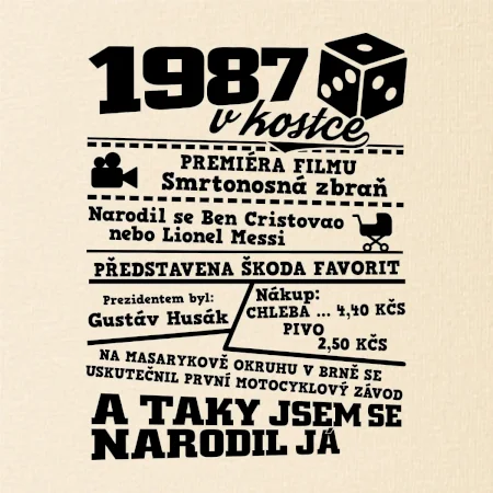 Narozeninové tričko pro ročník 1987. Sháníš originální dárek? Triko pro ročník 1987 v kostce je ten nejlepší dárek, kterým jistě potěšíš. Kolik co stálo? Kdo byl prezident? Kdo se narodil? Všechno tohle a ještě mnohem víc najdeš na našem oslaveneckém triku!