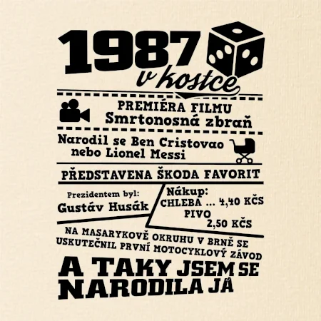 Narozeninové tričko pro ročník 1987. Sháníš originální dárek? Triko pro ročník 1987 v kostce je ten nejlepší dárek, kterým jistě potěšíš. Kolik co stálo? Kdo byl prezident? Kdo se narodil? Všechno tohle a ještě mnohem víc najdeš na našem oslaveneckém triku!