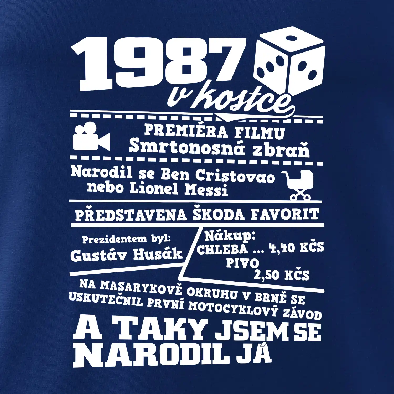 Narozeninové tričko pro ročník 1987. Sháníš originální dárek? Triko pro ročník 1987 v kostce je ten nejlepší dárek, kterým jistě potěšíš. Kolik co stálo? Kdo byl prezident? Kdo se narodil? Všechno tohle a ještě mnohem víc najdeš na našem oslaveneckém triku!