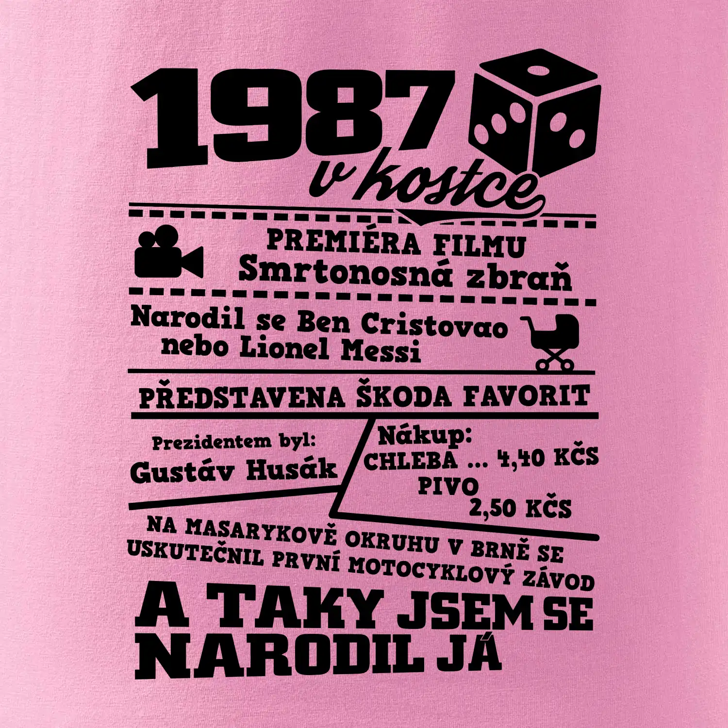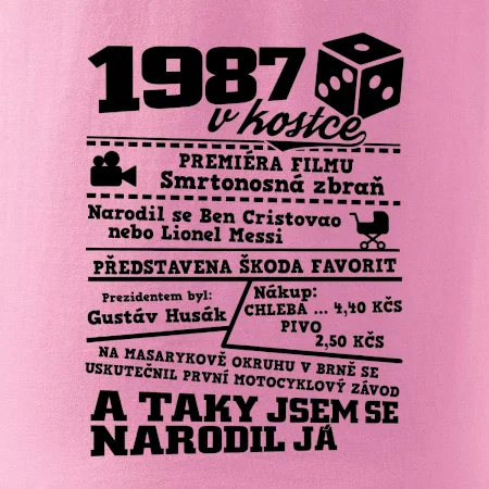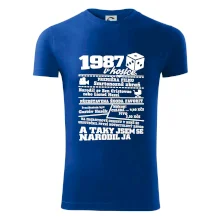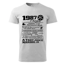 Narozeninové tričko pro ročník 1987. Sháníš originální dárek? Triko pro ročník 1987 v kostce je ten nejlepší dárek, kterým jistě potěšíš. Kolik co stálo? Kdo byl prezident? Kdo se narodil? Všechno tohle a ještě mnohem víc najdeš na našem oslaveneckém triku!
