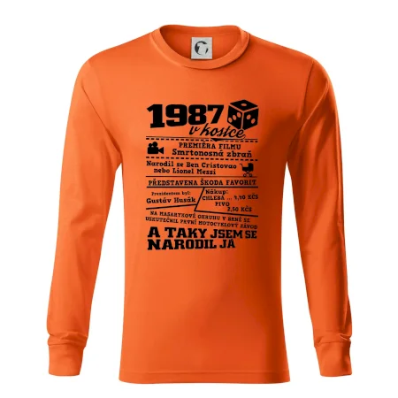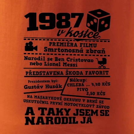 Narozeninové tričko pro ročník 1987. Sháníš originální dárek? Triko pro ročník 1987 v kostce je ten nejlepší dárek, kterým jistě potěšíš. Kolik co stálo? Kdo byl prezident? Kdo se narodil? Všechno tohle a ještě mnohem víc najdeš na našem oslaveneckém triku!