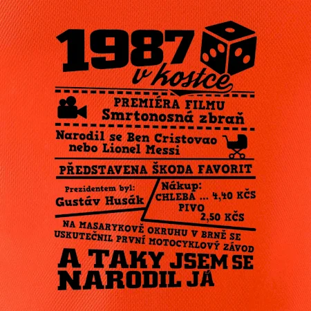 Narozeninové tričko pro ročník 1987. Sháníš originální dárek? Triko pro ročník 1987 v kostce je ten nejlepší dárek, kterým jistě potěšíš. Kolik co stálo? Kdo byl prezident? Kdo se narodil? Všechno tohle a ještě mnohem víc najdeš na našem oslaveneckém triku!