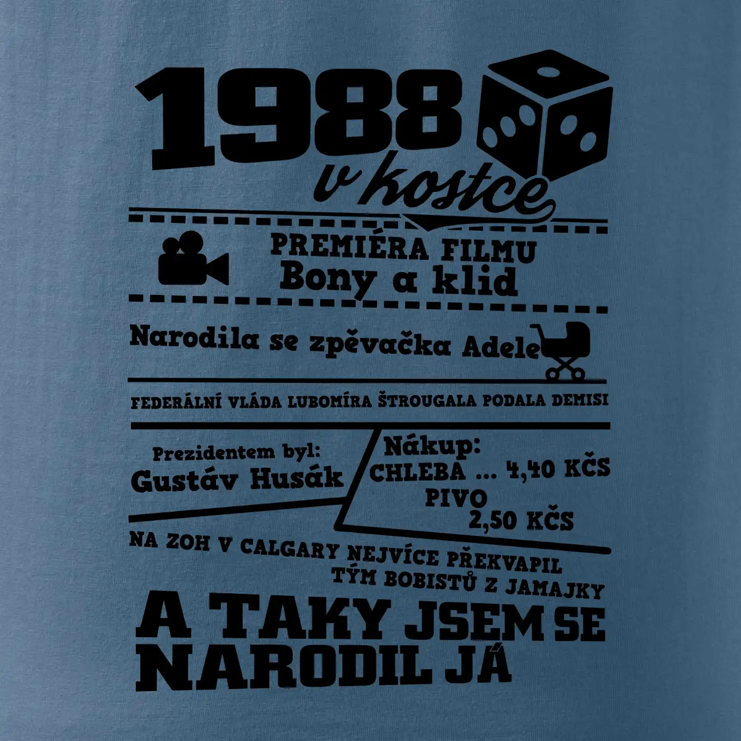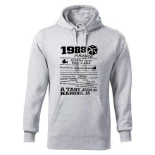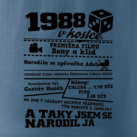 Narozeninové tričko pro ročník 1988. Sháníš originální dárek? Triko pro ročník 1988 v kostce je ten nejlepší dárek, kterým jistě potěšíš. Kolik co stálo? Kdo byl prezident? Kdo se narodil? Všechno tohle a ještě mnohem víc najdeš na našem oslaveneckém triku!