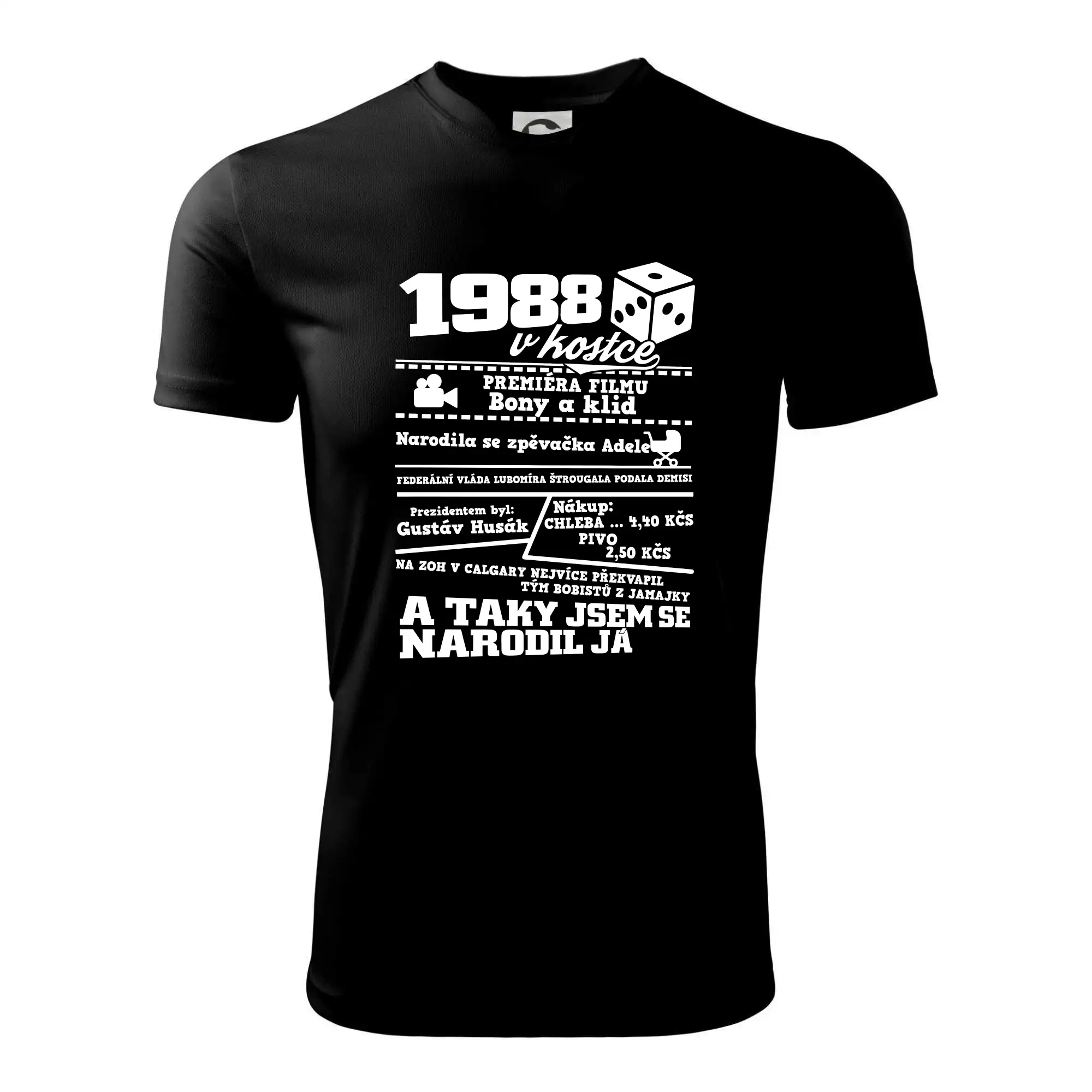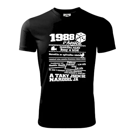 Narozeninové tričko pro ročník 1988. Sháníš originální dárek? Triko pro ročník 1988 v kostce je ten nejlepší dárek, kterým jistě potěšíš. Kolik co stálo? Kdo byl prezident? Kdo se narodil? Všechno tohle a ještě mnohem víc najdeš na našem oslaveneckém triku!