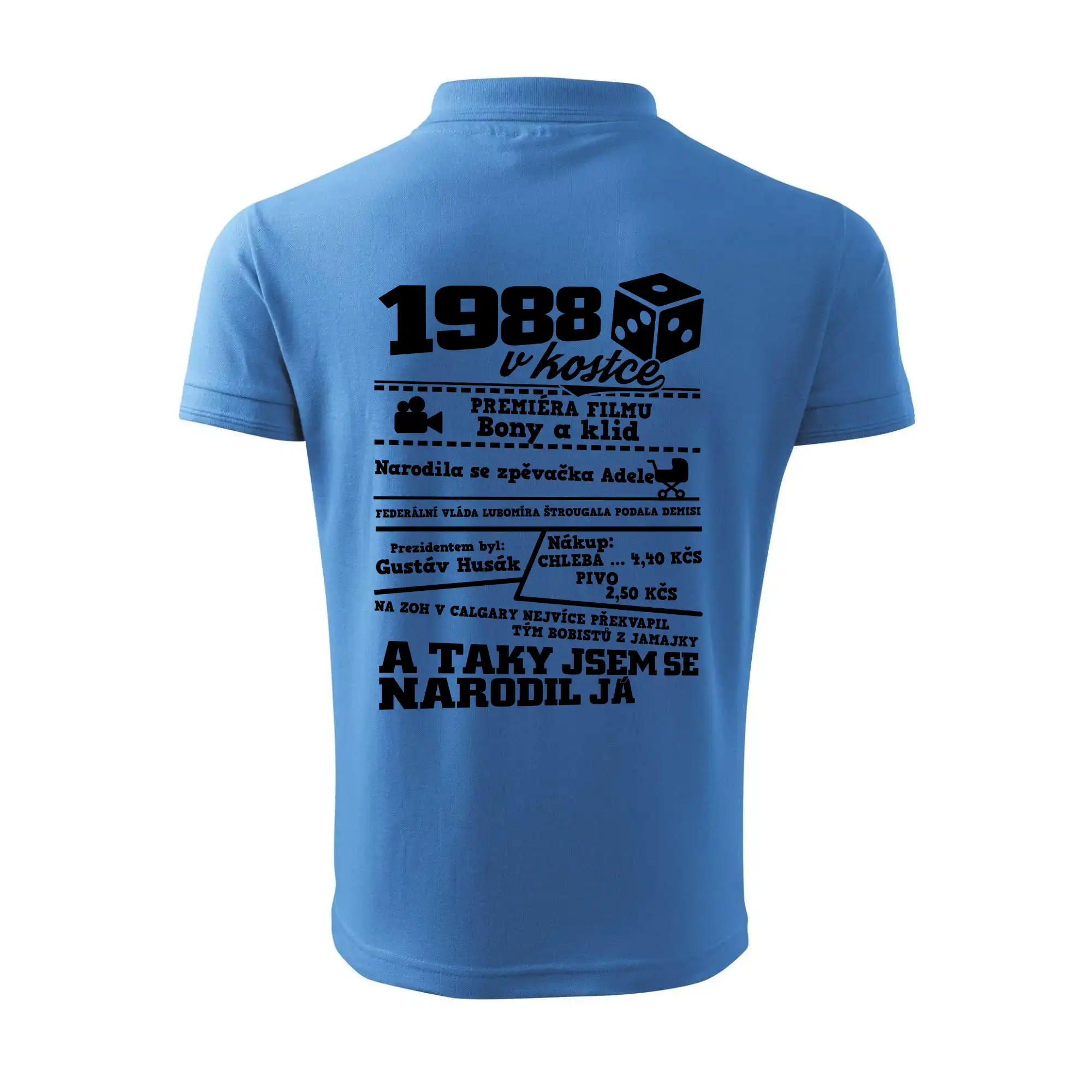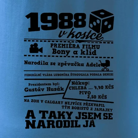 Narozeninové tričko pro ročník 1988. Sháníš originální dárek? Triko pro ročník 1988 v kostce je ten nejlepší dárek, kterým jistě potěšíš. Kolik co stálo? Kdo byl prezident? Kdo se narodil? Všechno tohle a ještě mnohem víc najdeš na našem oslaveneckém triku!