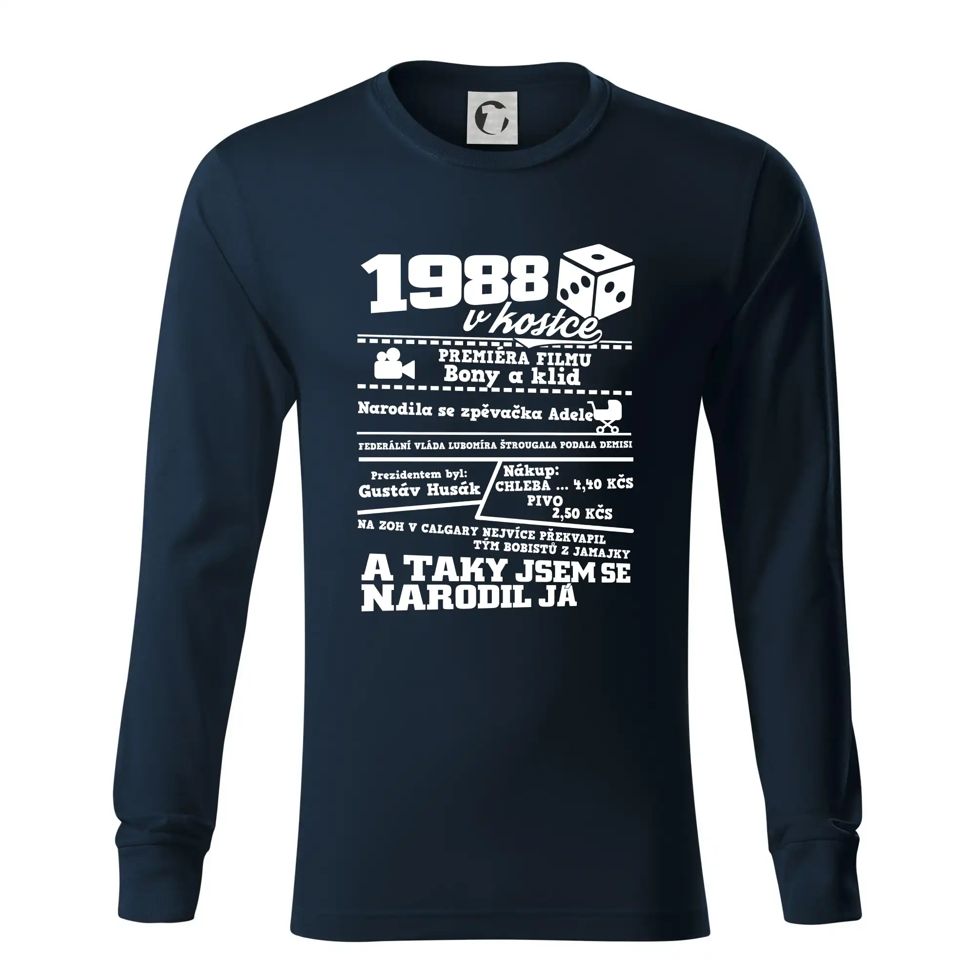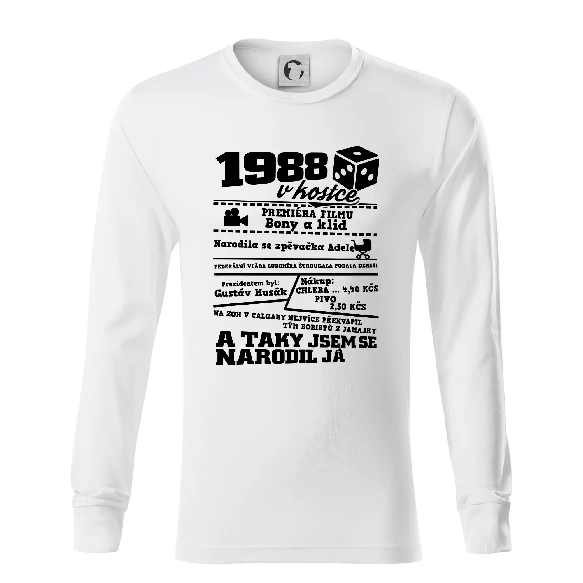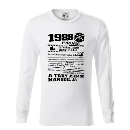 Narozeninové tričko pro ročník 1988. Sháníš originální dárek? Triko pro ročník 1988 v kostce je ten nejlepší dárek, kterým jistě potěšíš. Kolik co stálo? Kdo byl prezident? Kdo se narodil? Všechno tohle a ještě mnohem víc najdeš na našem oslaveneckém triku!