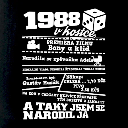 Narozeninové tričko pro ročník 1988. Sháníš originální dárek? Triko pro ročník 1988 v kostce je ten nejlepší dárek, kterým jistě potěšíš. Kolik co stálo? Kdo byl prezident? Kdo se narodil? Všechno tohle a ještě mnohem víc najdeš na našem oslaveneckém triku!