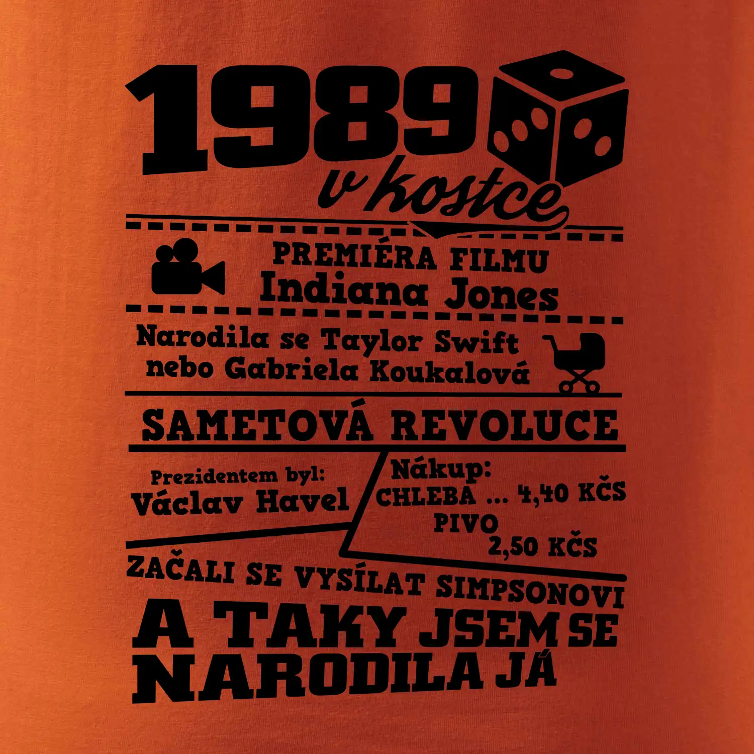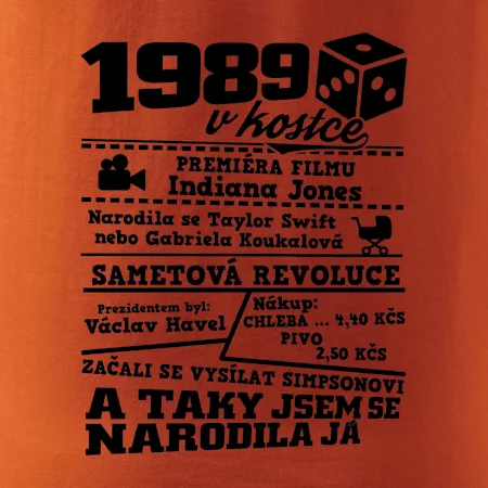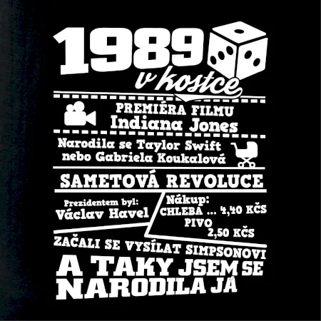 Narozeninové tričko pro ročník 1989. Sháníš originální dárek? Triko pro ročník 1989 v kostce je ten nejlepší dárek, kterým jistě potěšíš. Kolik co stálo? Kdo byl prezident? Kdo se narodil? Všechno tohle a ještě mnohem víc najdeš na našem oslaveneckém triku!