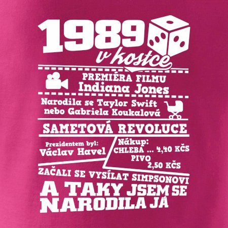 Narozeninové tričko pro ročník 1989. Sháníš originální dárek? Triko pro ročník 1989 v kostce je ten nejlepší dárek, kterým jistě potěšíš. Kolik co stálo? Kdo byl prezident? Kdo se narodil? Všechno tohle a ještě mnohem víc najdeš na našem oslaveneckém triku!