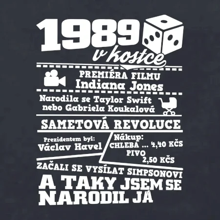 Narozeninové tričko pro ročník 1989. Sháníš originální dárek? Triko pro ročník 1989 v kostce je ten nejlepší dárek, kterým jistě potěšíš. Kolik co stálo? Kdo byl prezident? Kdo se narodil? Všechno tohle a ještě mnohem víc najdeš na našem oslaveneckém triku!