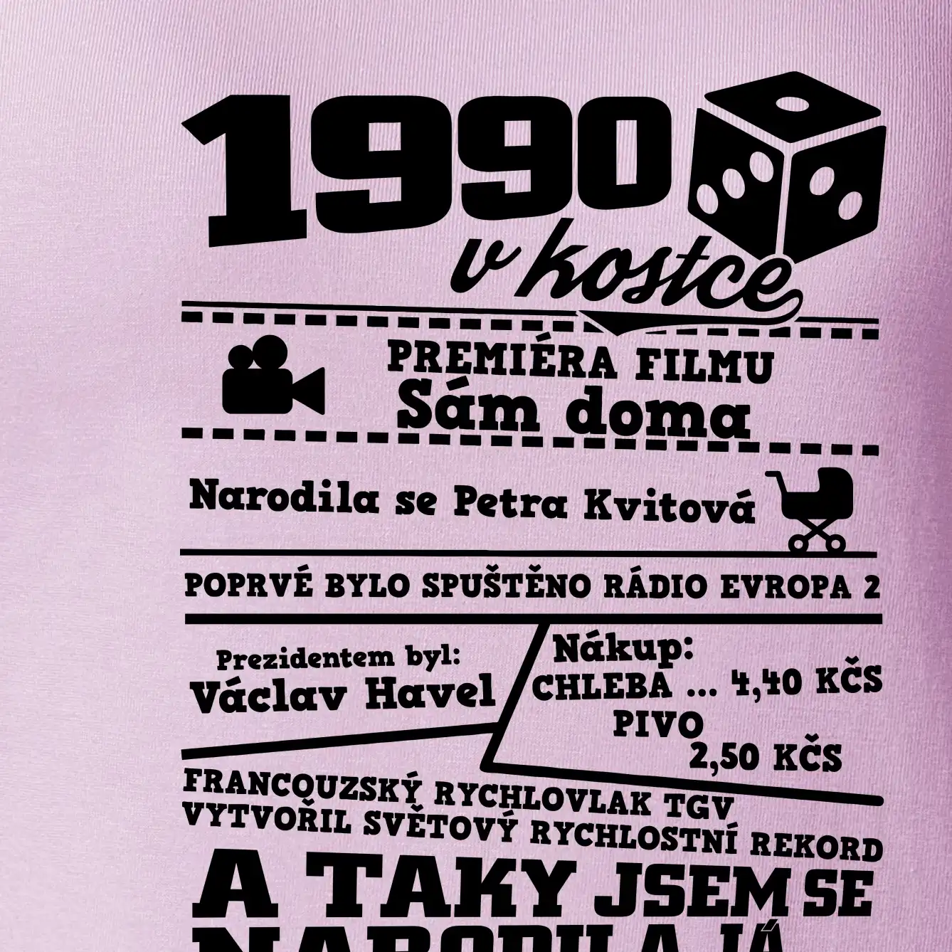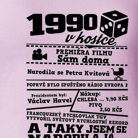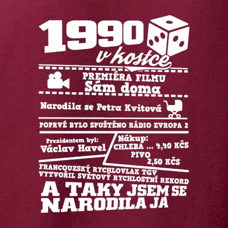 Narozeninové tričko pro ročník 1990. Sháníš originální dárek? Triko pro ročník 1990 v kostce je ten nejlepší dárek, kterým jistě potěšíš. Kolik co stálo? Kdo byl prezident? Kdo se narodil? Všechno tohle a ještě mnohem víc najdeš na našem oslaveneckém triku!
