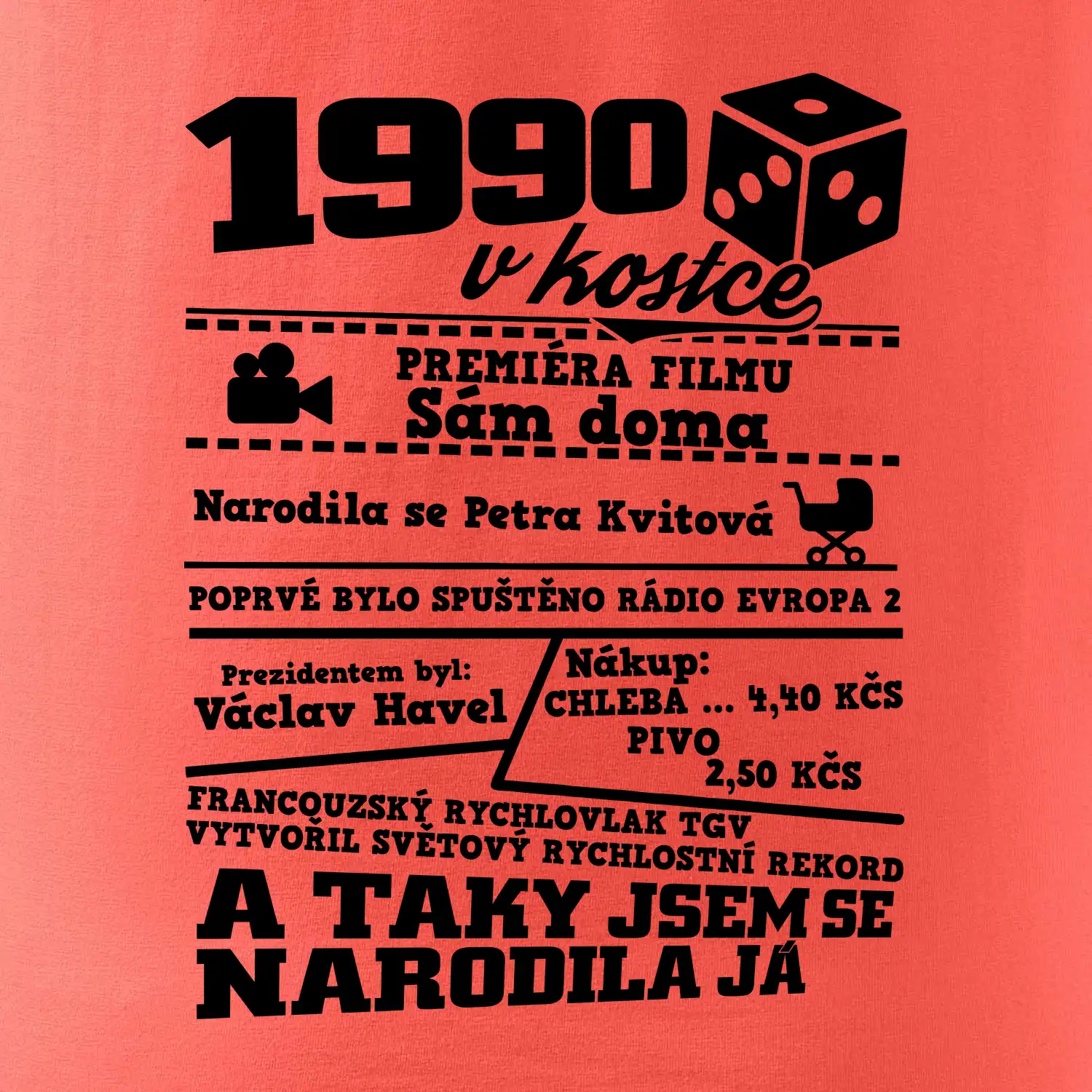 Narozeninové tričko pro ročník 1990. Sháníš originální dárek? Triko pro ročník 1990 v kostce je ten nejlepší dárek, kterým jistě potěšíš. Kolik co stálo? Kdo byl prezident? Kdo se narodil? Všechno tohle a ještě mnohem víc najdeš na našem oslaveneckém triku!