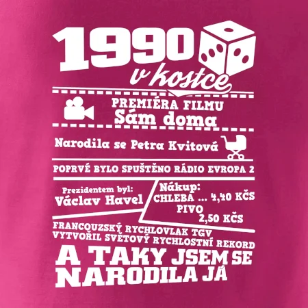 Narozeninové tričko pro ročník 1990. Sháníš originální dárek? Triko pro ročník 1990 v kostce je ten nejlepší dárek, kterým jistě potěšíš. Kolik co stálo? Kdo byl prezident? Kdo se narodil? Všechno tohle a ještě mnohem víc najdeš na našem oslaveneckém triku!