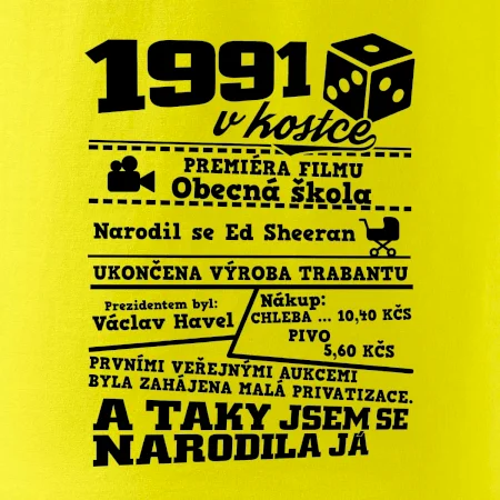 Narozeninové tričko pro ročník 1991. Sháníš originální dárek? Triko pro ročník 1991 v kostce je ten nejlepší dárek, kterým jistě potěšíš. Kolik co stálo? Kdo byl prezident? Kdo se narodil? Všechno tohle a ještě mnohem víc najdeš na našem oslaveneckém triku!