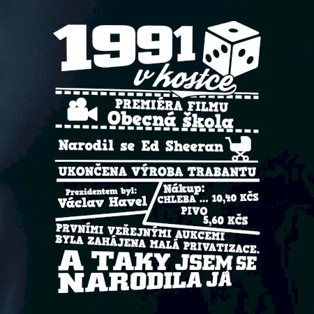 Narozeninové tričko pro ročník 1991. Sháníš originální dárek? Triko pro ročník 1991 v kostce je ten nejlepší dárek, kterým jistě potěšíš. Kolik co stálo? Kdo byl prezident? Kdo se narodil? Všechno tohle a ještě mnohem víc najdeš na našem oslaveneckém triku!