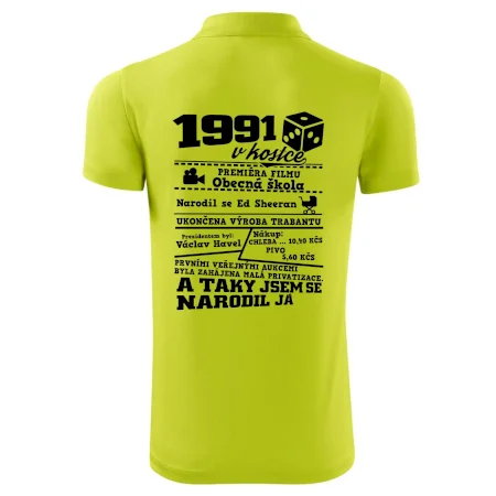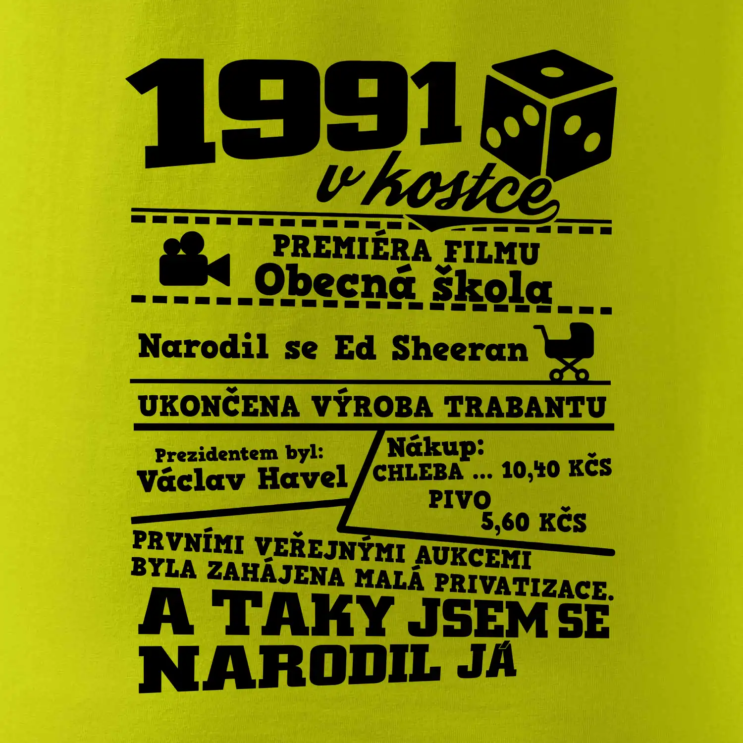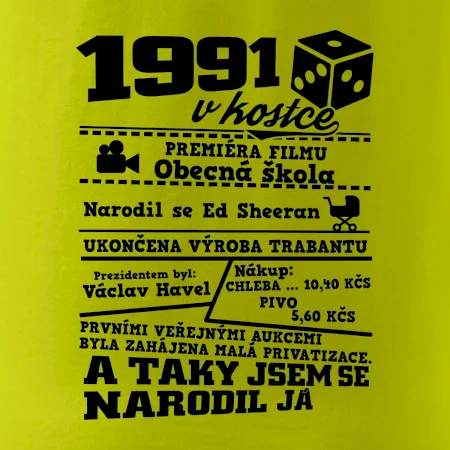 Narozeninové tričko pro ročník 1991. Sháníš originální dárek? Triko pro ročník 1991 v kostce je ten nejlepší dárek, kterým jistě potěšíš. Kolik co stálo? Kdo byl prezident? Kdo se narodil? Všechno tohle a ještě mnohem víc najdeš na našem oslaveneckém triku!