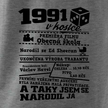 Narozeninové tričko pro ročník 1991. Sháníš originální dárek? Triko pro ročník 1991 v kostce je ten nejlepší dárek, kterým jistě potěšíš. Kolik co stálo? Kdo byl prezident? Kdo se narodil? Všechno tohle a ještě mnohem víc najdeš na našem oslaveneckém triku!
