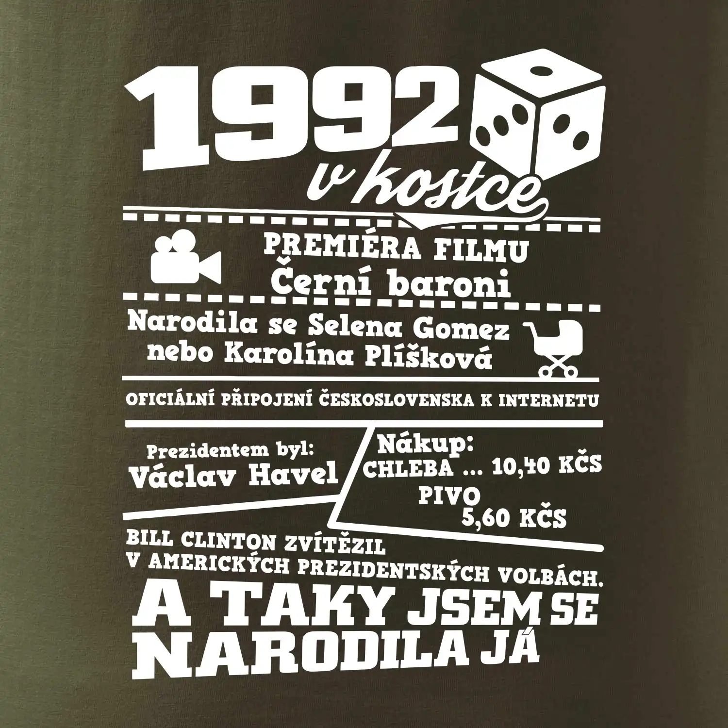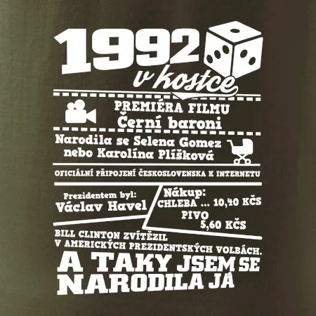 Narozeninové tričko pro ročník 1992. Sháníš originální dárek? Triko pro ročník 1992 v kostce je ten nejlepší dárek, kterým jistě potěšíš. Kolik co stálo? Kdo byl prezident? Kdo se narodil? Všechno tohle a ještě mnohem víc najdeš na našem oslaveneckém triku!