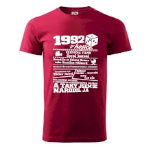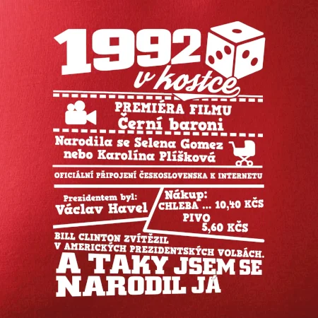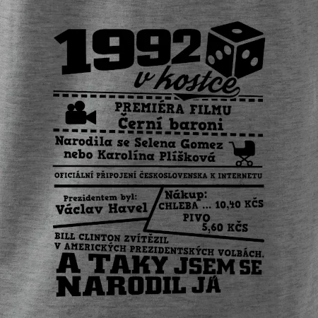 Narozeninové tričko pro ročník 1992. Sháníš originální dárek? Triko pro ročník 1992 v kostce je ten nejlepší dárek, kterým jistě potěšíš. Kolik co stálo? Kdo byl prezident? Kdo se narodil? Všechno tohle a ještě mnohem víc najdeš na našem oslaveneckém triku!
