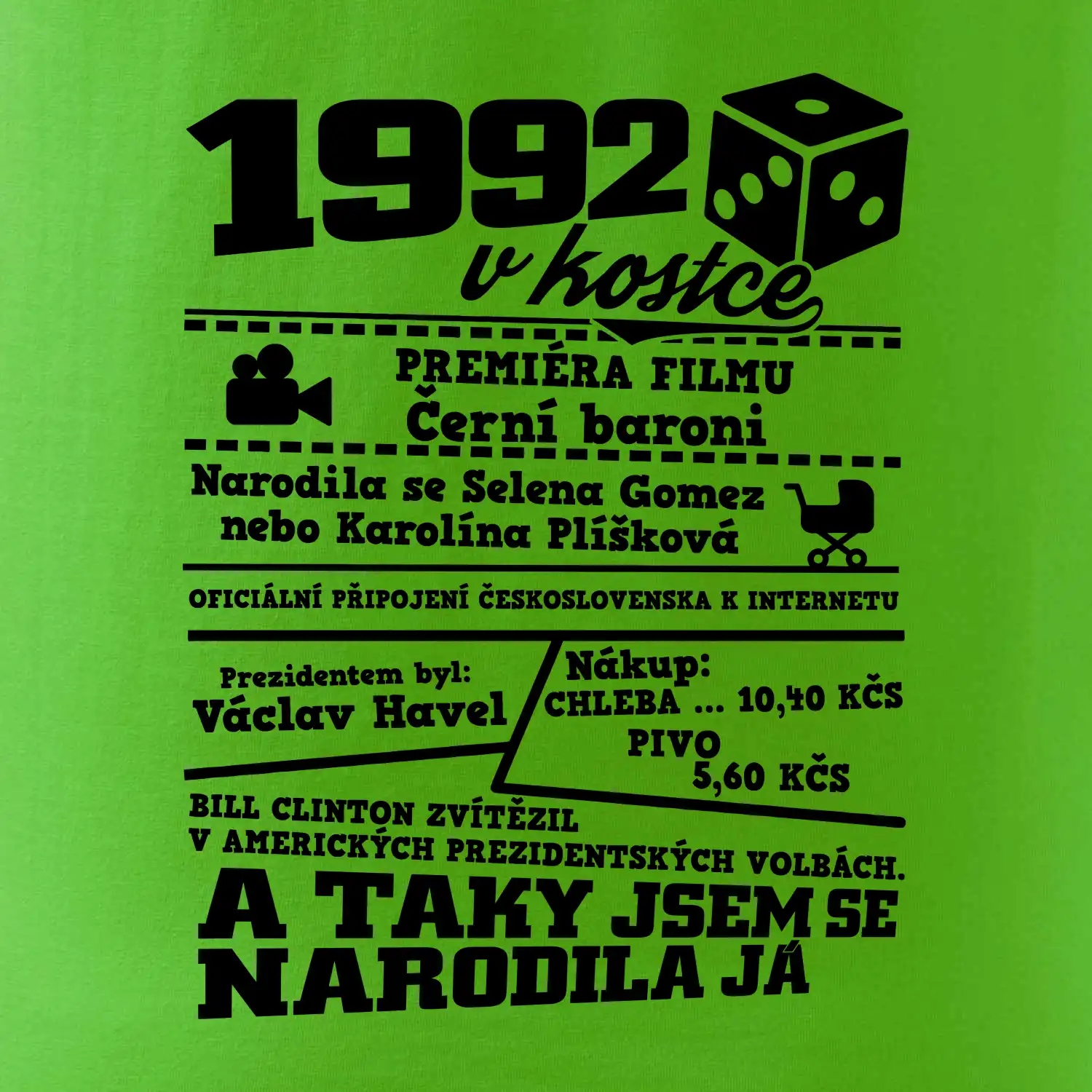 Narozeninové tričko pro ročník 1992. Sháníš originální dárek? Triko pro ročník 1992 v kostce je ten nejlepší dárek, kterým jistě potěšíš. Kolik co stálo? Kdo byl prezident? Kdo se narodil? Všechno tohle a ještě mnohem víc najdeš na našem oslaveneckém triku!