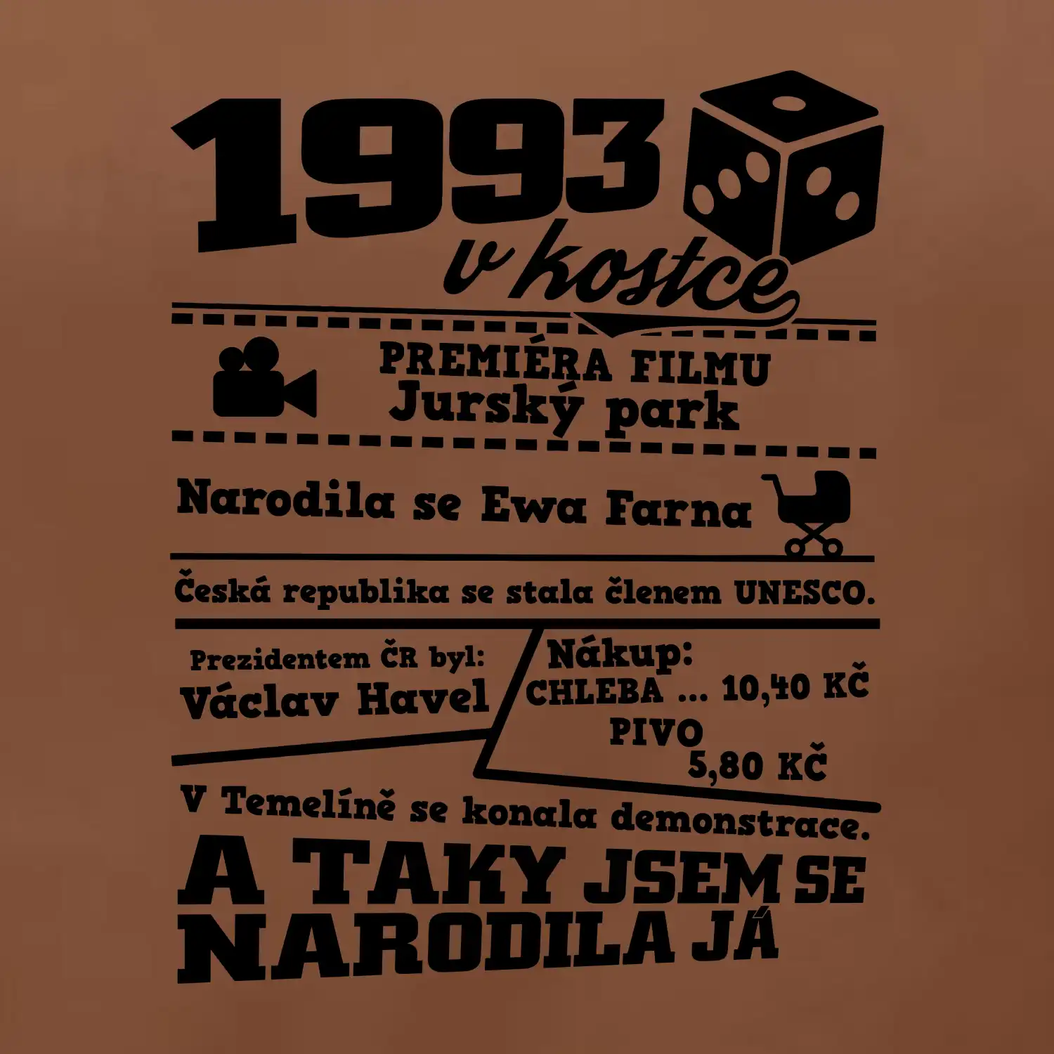 Narozeninové tričko pro ročník 1993. Sháníš originální dárek? Triko pro ročník 1993 v kostce je ten nejlepší dárek, kterým jistě potěšíš. Kolik co stálo? Kdo byl prezident? Kdo se narodil? Všechno tohle a ještě mnohem víc najdeš na našem oslaveneckém triku!
