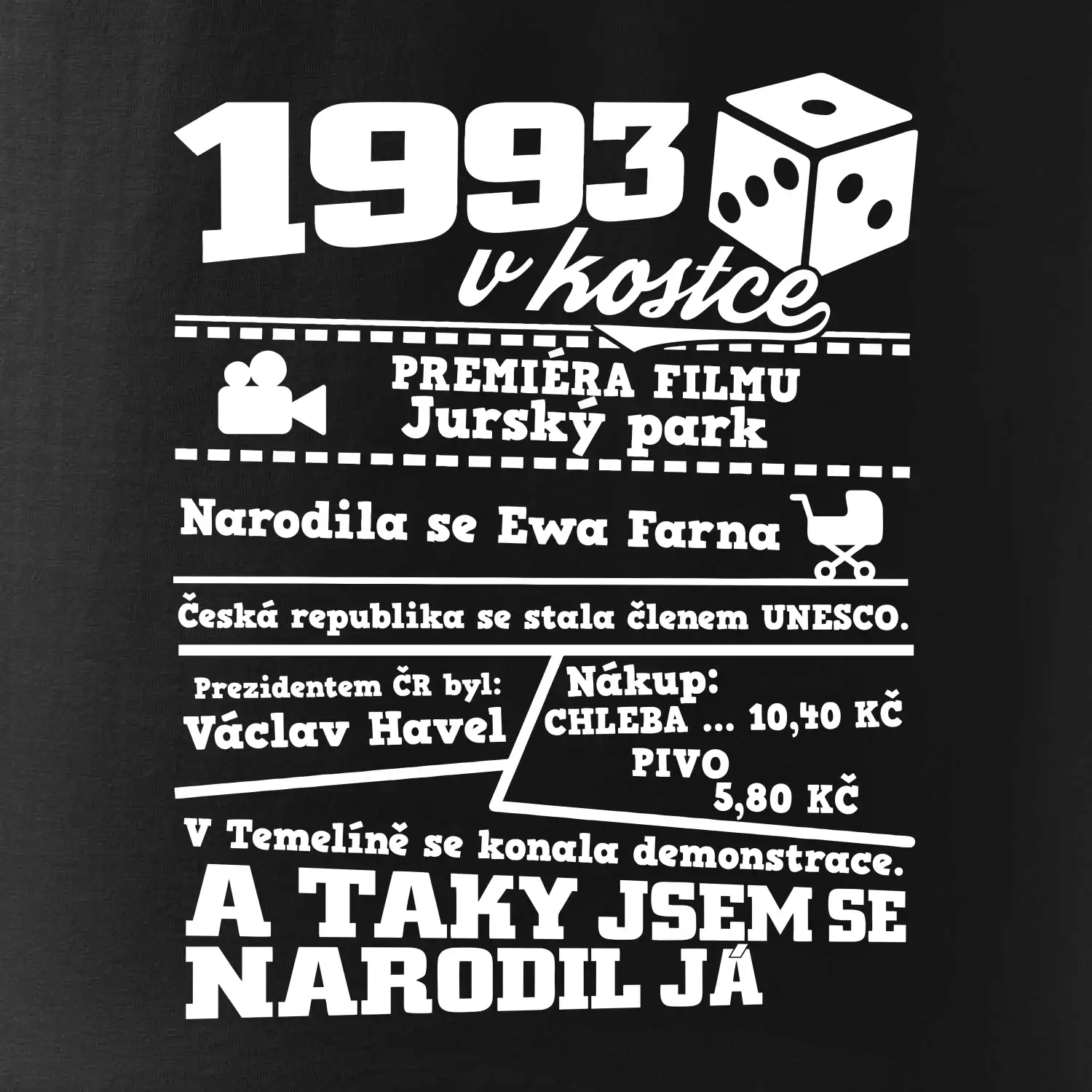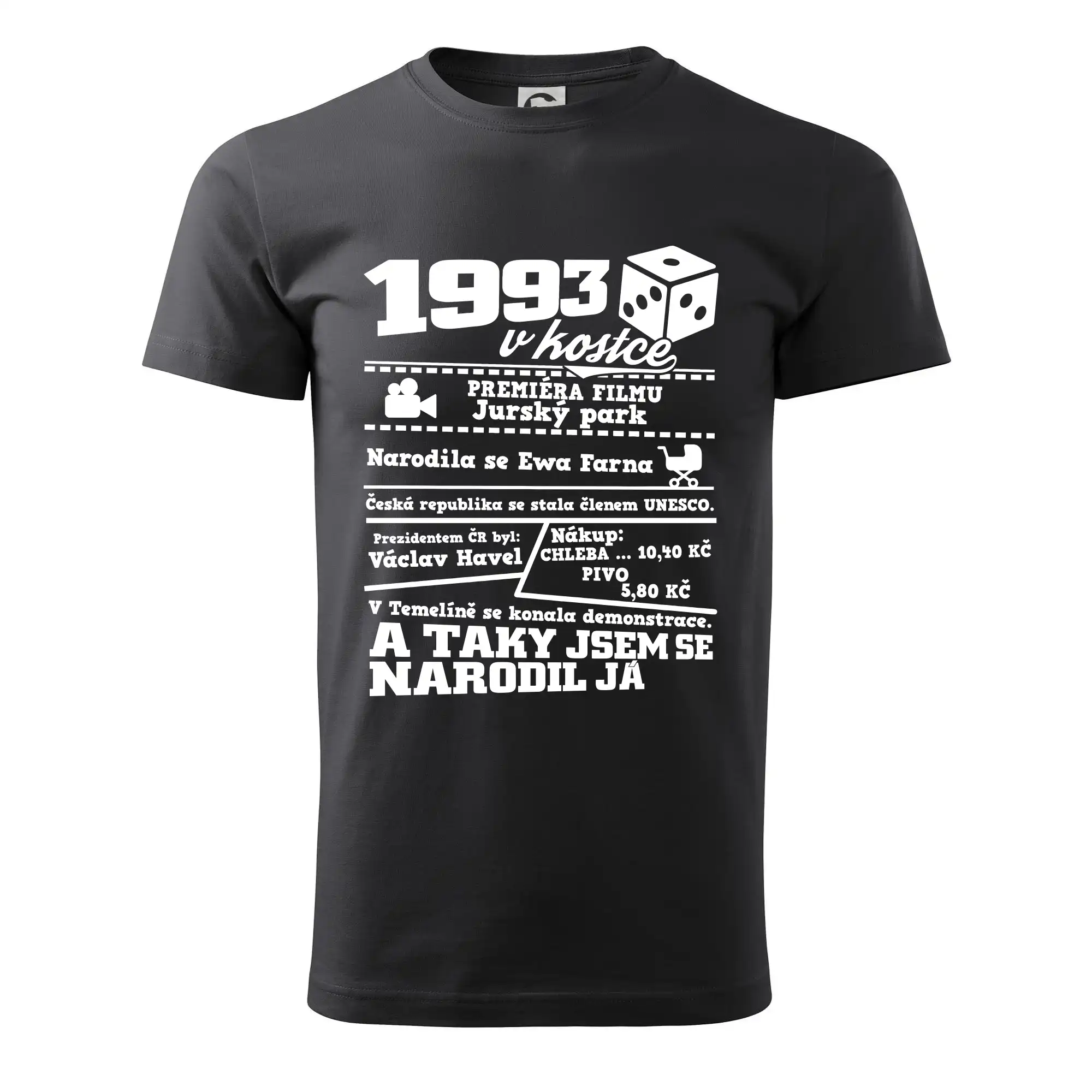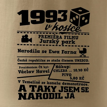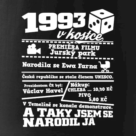 Narozeninové tričko pro ročník 1993. Sháníš originální dárek? Triko pro ročník 1993 v kostce je ten nejlepší dárek, kterým jistě potěšíš. Kolik co stálo? Kdo byl prezident? Kdo se narodil? Všechno tohle a ještě mnohem víc najdeš na našem oslaveneckém triku!