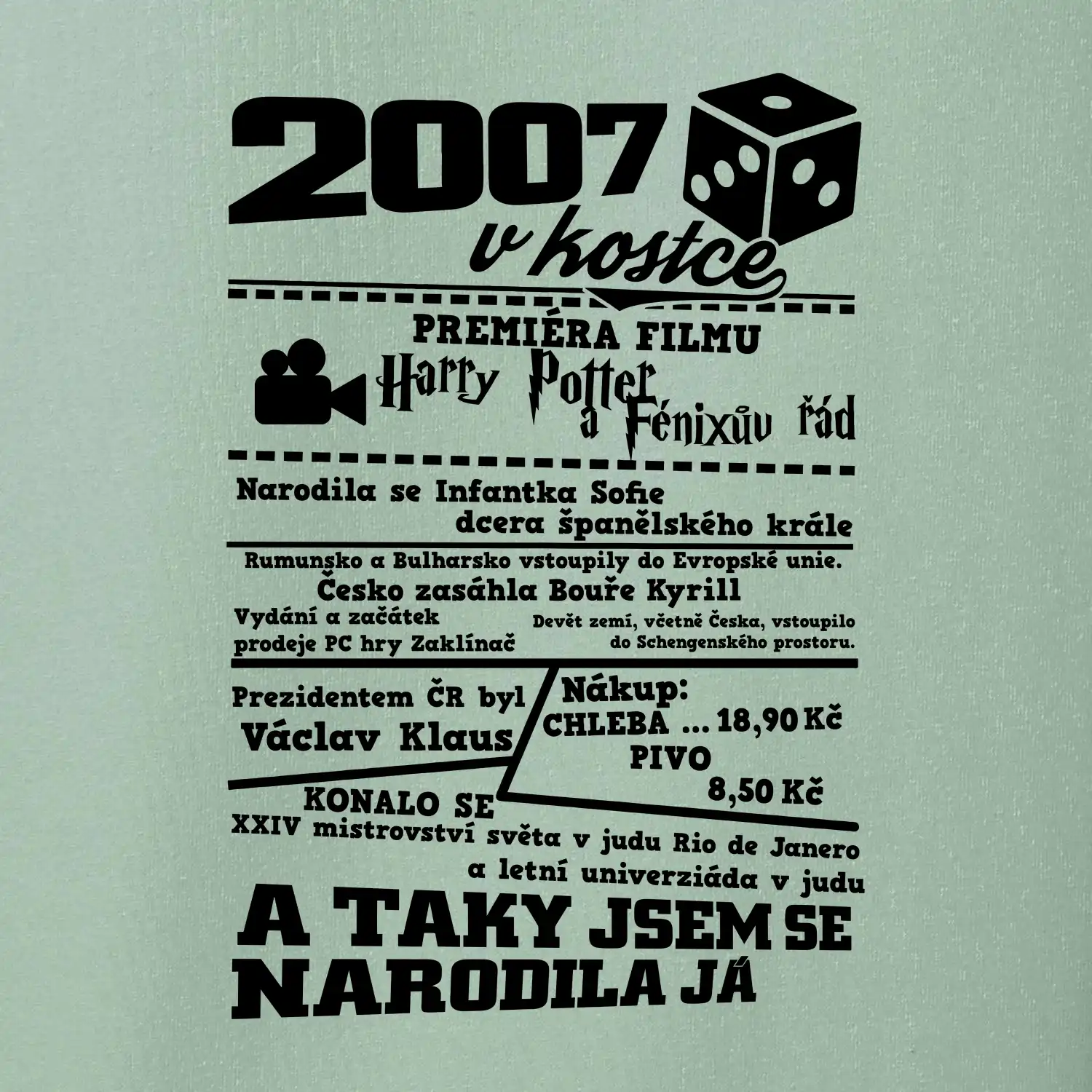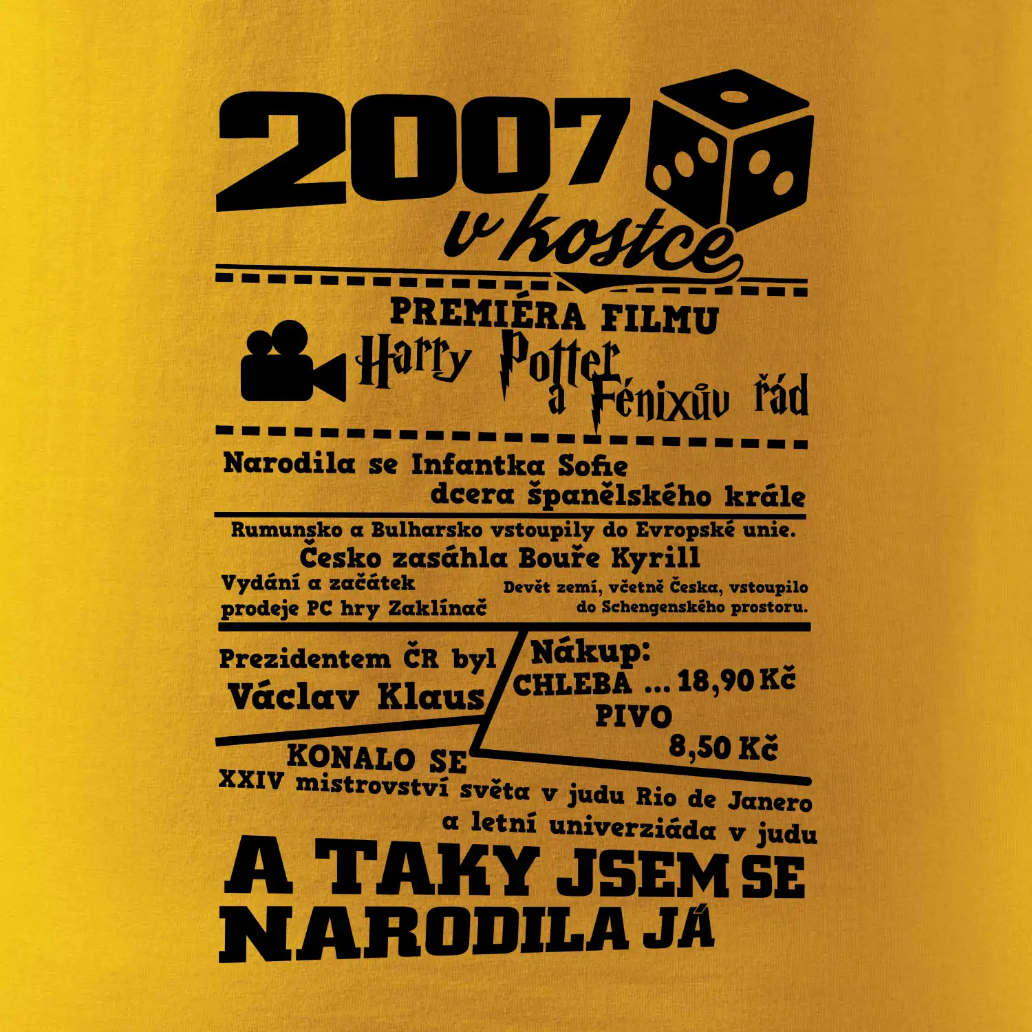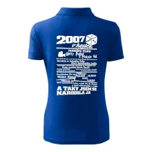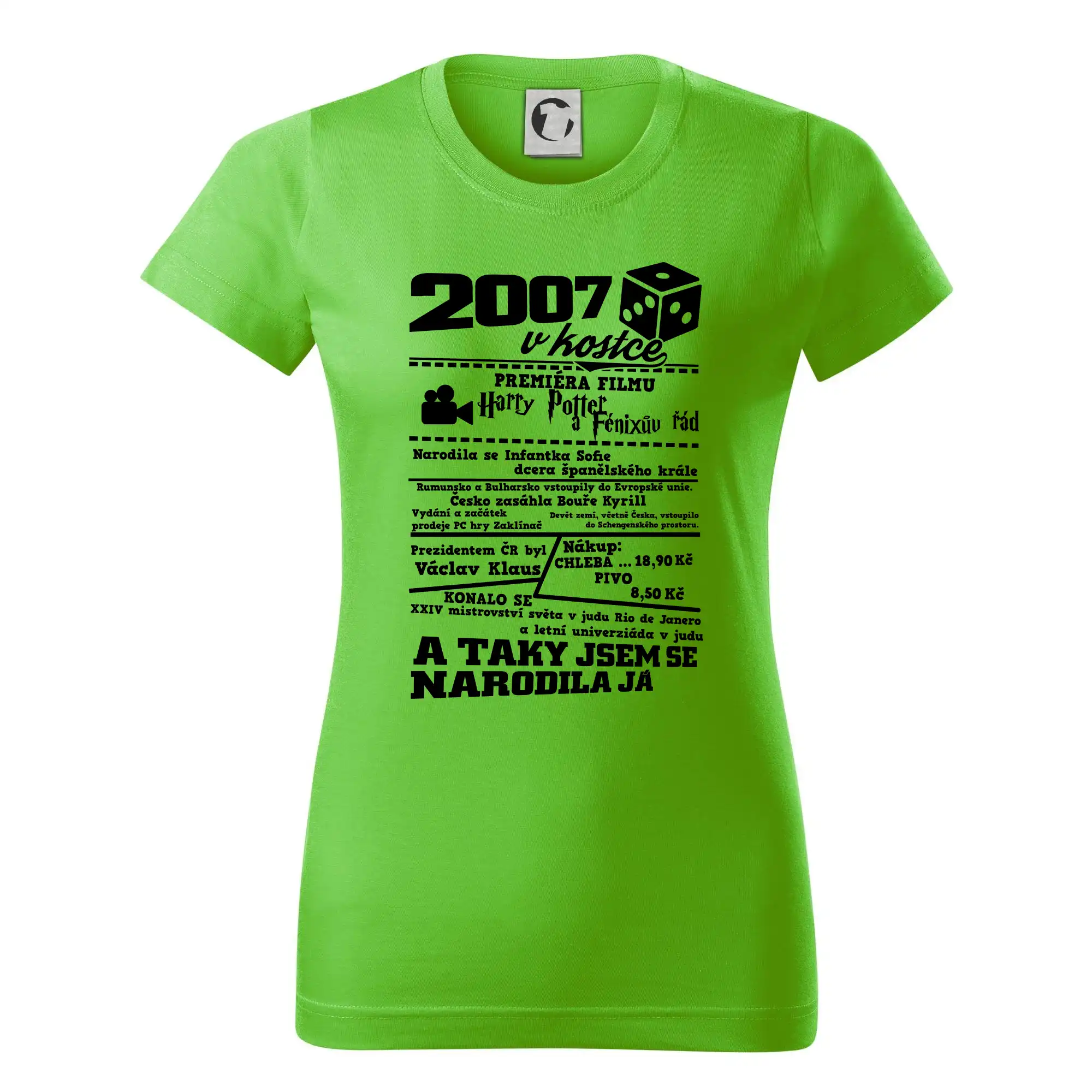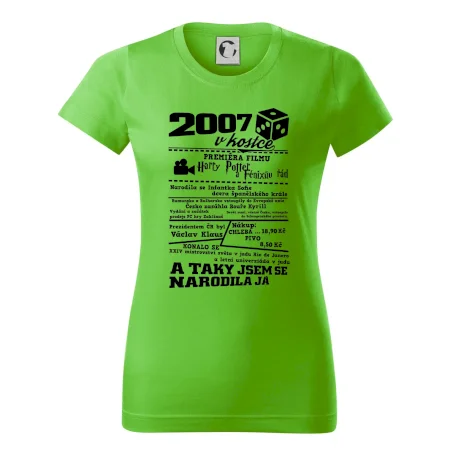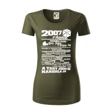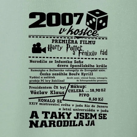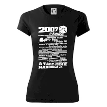 Narozeninové tričko pro ročník 2007. Sháníš originální dárek? Triko pro ročník 2007 v kostce je ten nejlepší dárek, kterým jistě potěšíš. Kolik co stálo? Kdo byl prezident? Kdo se narodil? Všechno tohle a ještě mnohem víc najdeš na našem oslaveneckém triku!