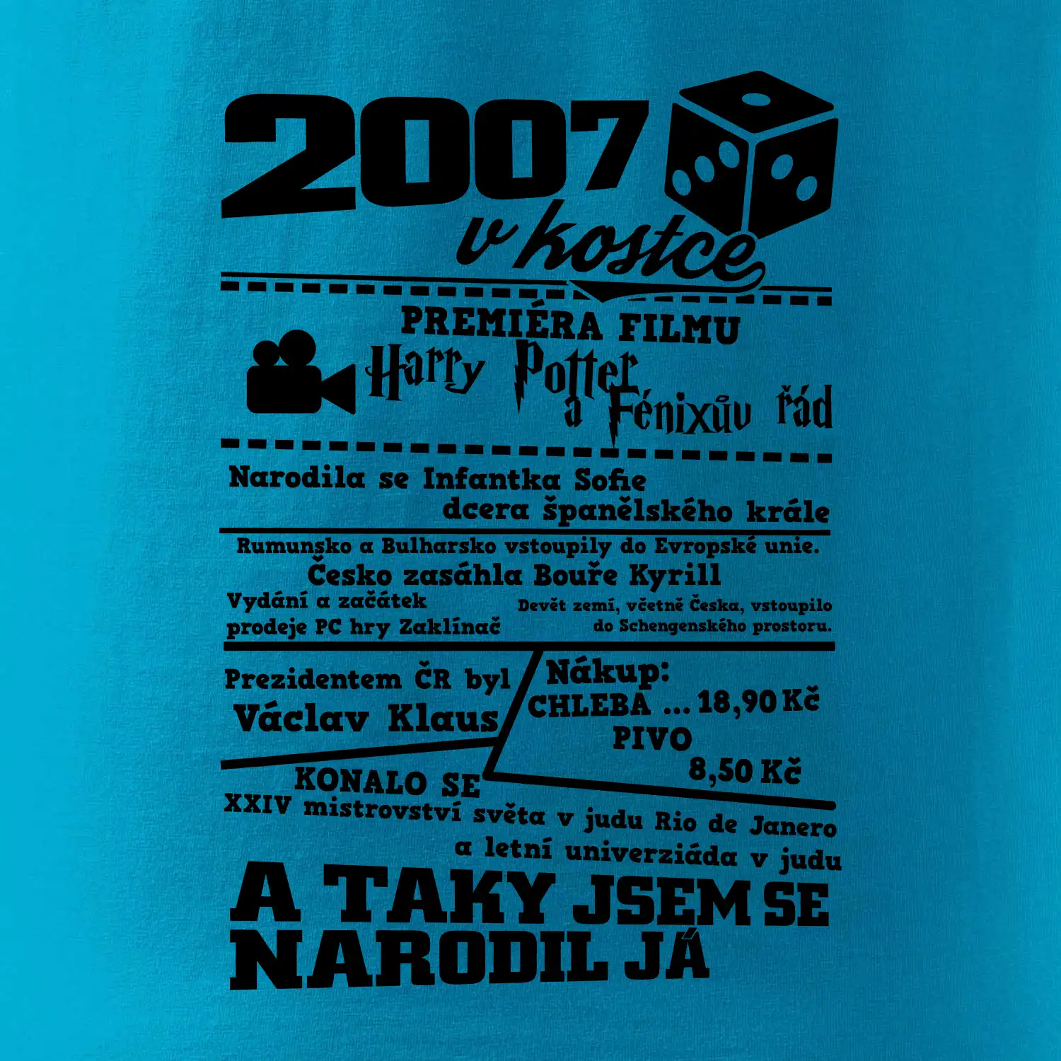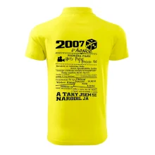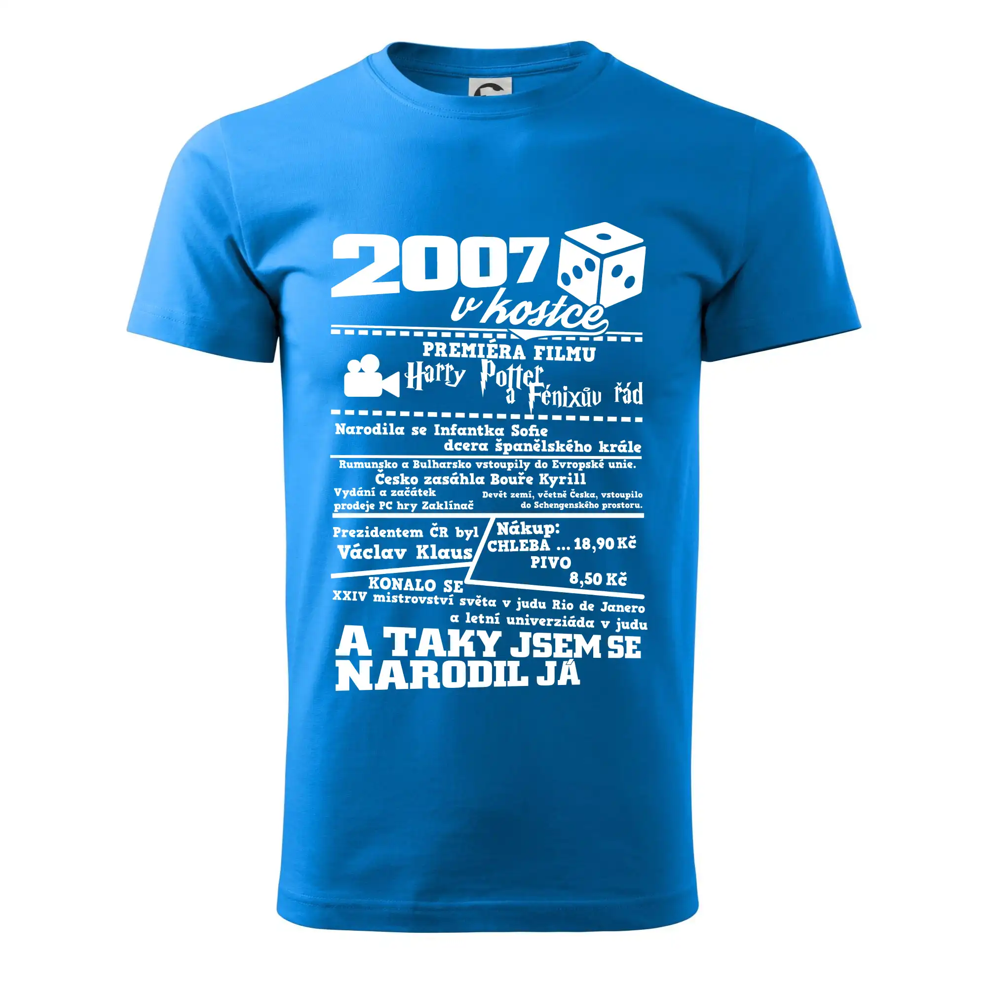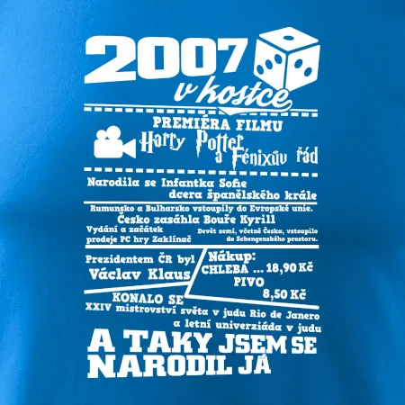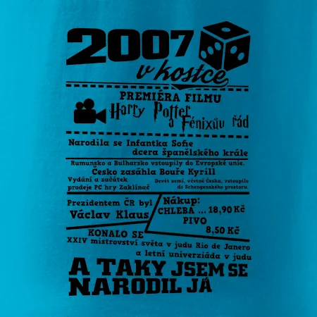 Narozeninové tričko pro ročník 2007. Sháníš originální dárek? Triko pro ročník 2007 v kostce je ten nejlepší dárek, kterým jistě potěšíš. Kolik co stálo? Kdo byl prezident? Kdo se narodil? Všechno tohle a ještě mnohem víc najdeš na našem oslaveneckém triku!