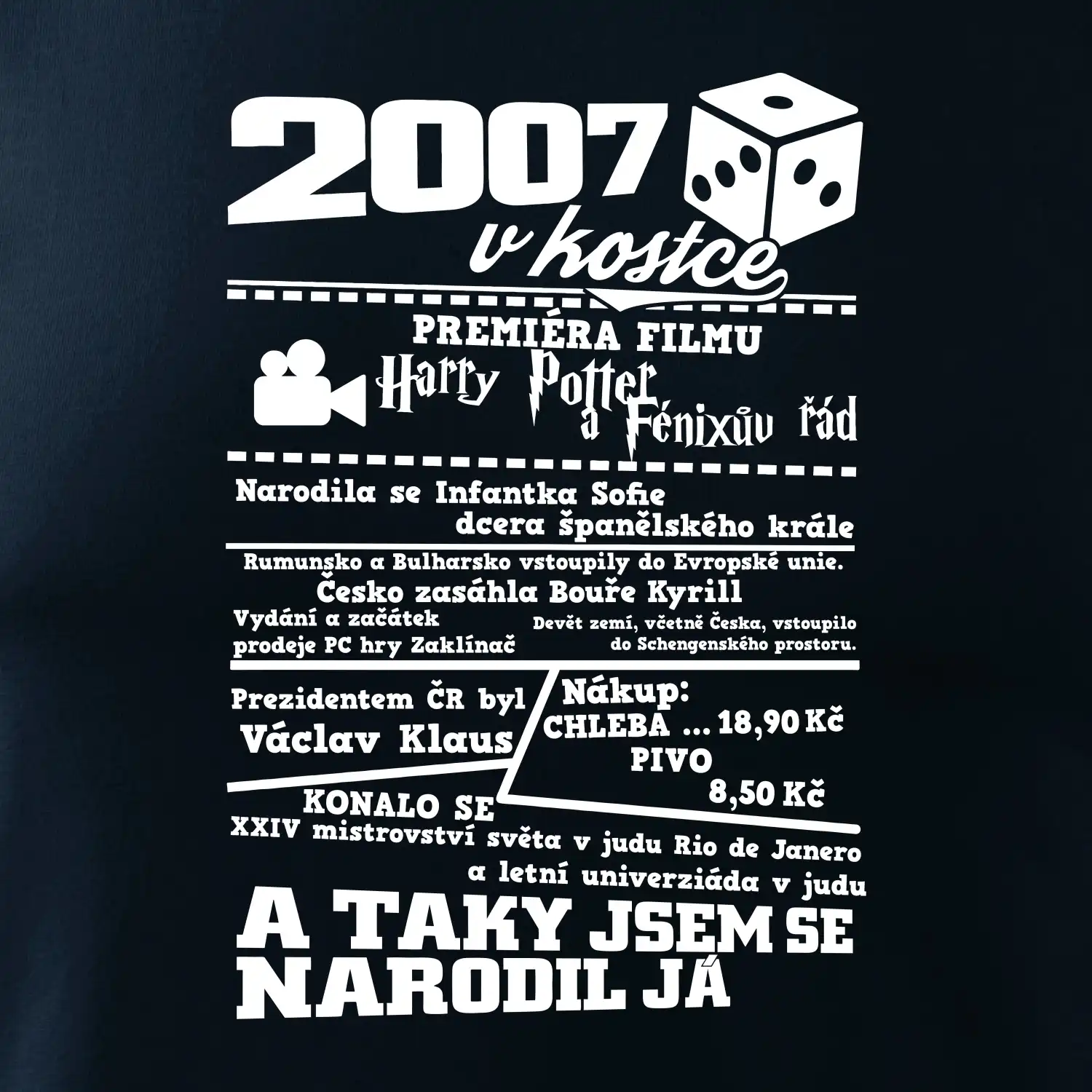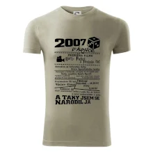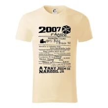 Narozeninové tričko pro ročník 2007. Sháníš originální dárek? Triko pro ročník 2007 v kostce je ten nejlepší dárek, kterým jistě potěšíš. Kolik co stálo? Kdo byl prezident? Kdo se narodil? Všechno tohle a ještě mnohem víc najdeš na našem oslaveneckém triku!