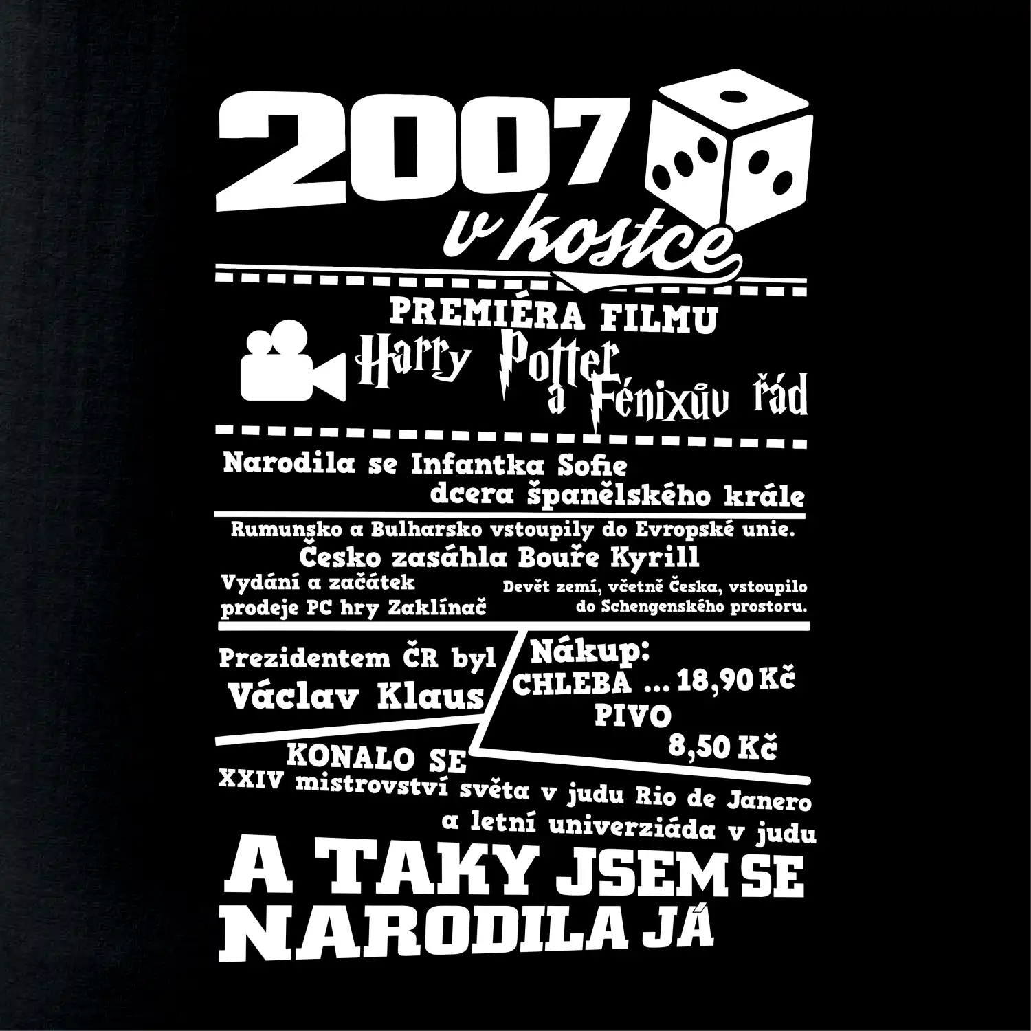 Narozeninové tričko pro ročník 2007. Sháníš originální dárek? Triko pro ročník 2007 v kostce je ten nejlepší dárek, kterým jistě potěšíš. Kolik co stálo? Kdo byl prezident? Kdo se narodil? Všechno tohle a ještě mnohem víc najdeš na našem oslaveneckém triku!