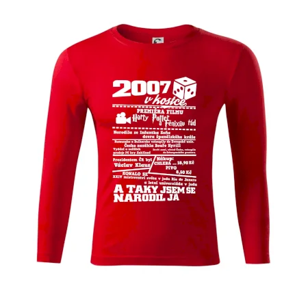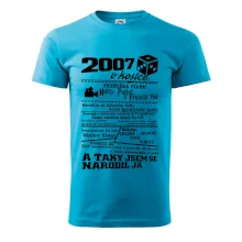 Narozeninové tričko pro ročník 2007. Sháníš originální dárek? Triko pro ročník 2007 v kostce je ten nejlepší dárek, kterým jistě potěšíš. Kolik co stálo? Kdo byl prezident? Kdo se narodil? Všechno tohle a ještě mnohem víc najdeš na našem oslaveneckém triku!