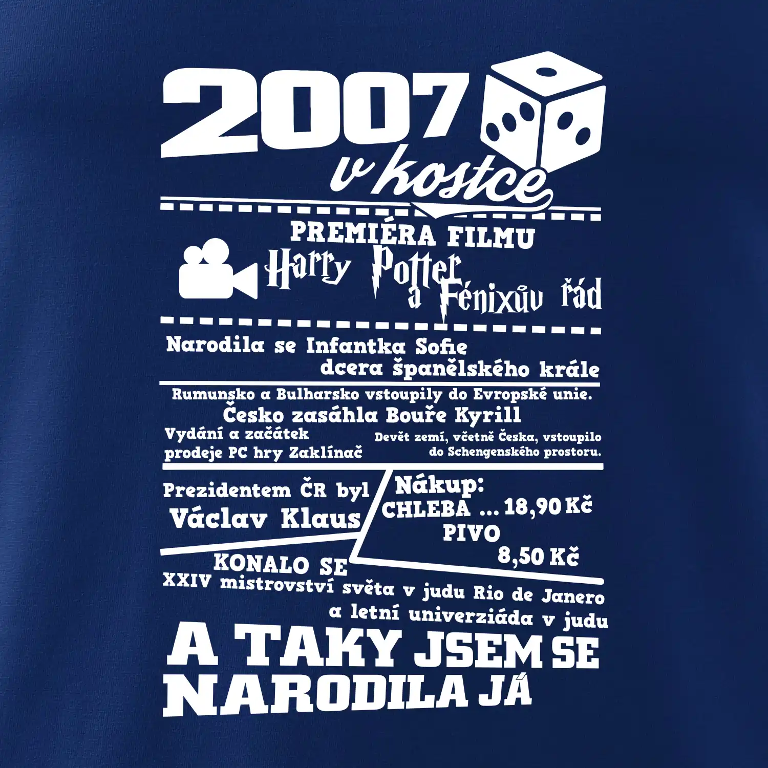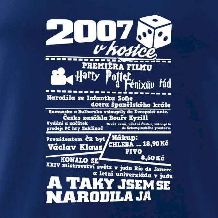 Narozeninové tričko pro ročník 2007. Sháníš originální dárek? Triko pro ročník 2007 v kostce je ten nejlepší dárek, kterým jistě potěšíš. Kolik co stálo? Kdo byl prezident? Kdo se narodil? Všechno tohle a ještě mnohem víc najdeš na našem oslaveneckém triku!
