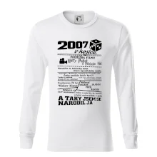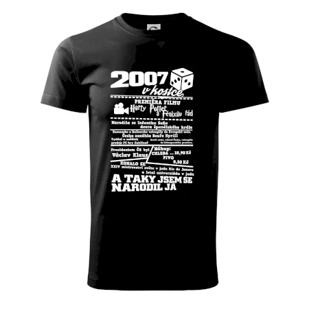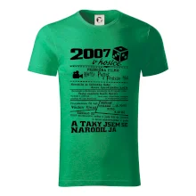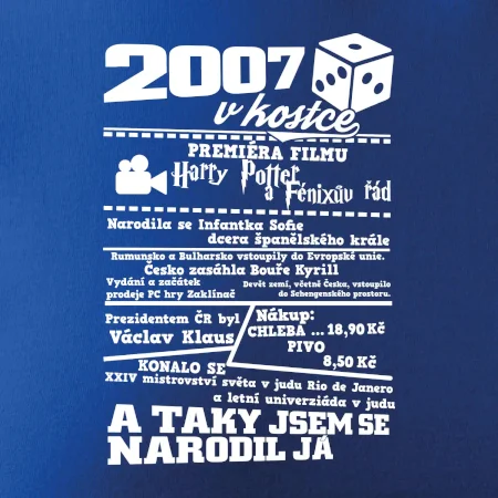 Narozeninové tričko pro ročník 2007. Sháníš originální dárek? Triko pro ročník 2007 v kostce je ten nejlepší dárek, kterým jistě potěšíš. Kolik co stálo? Kdo byl prezident? Kdo se narodil? Všechno tohle a ještě mnohem víc najdeš na našem oslaveneckém triku!