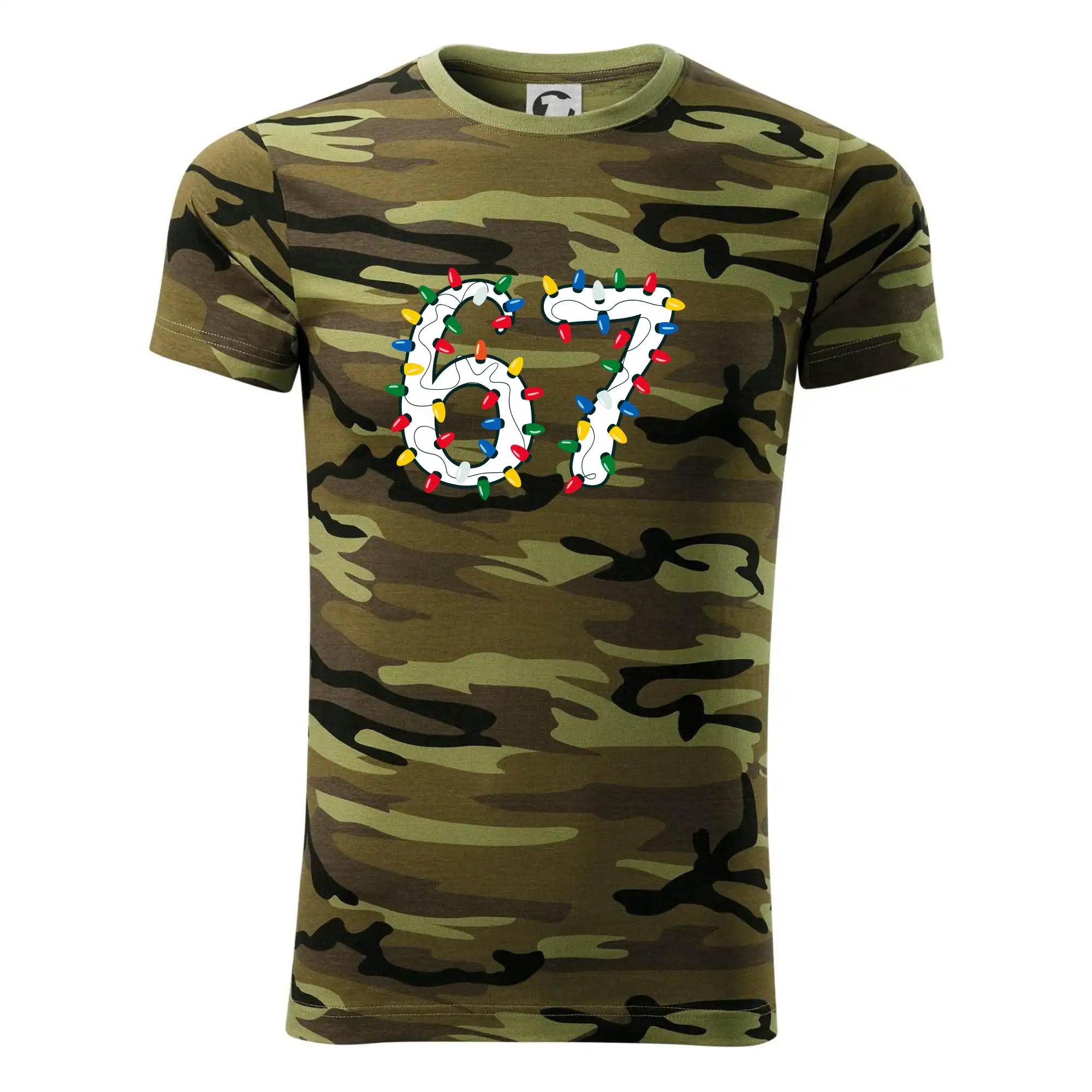 Tričko střední gramáže v barvách camouflage. Střih s bočními švy. Lem průkrčníku ze žebrového úpletu s přídavkem 5 % elastanu. Vnitřní část zadního průkrčníku začištěna páskou v barvě camouflage.