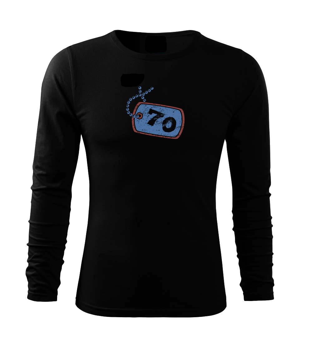 Narozeninové triko pro oslavence, který slaví jubileum 70 let. Triko na kterém je psí známka s číslovkou 70. Dárek k sedmdesátinám. Triko k sedmdesátým narozeninám.