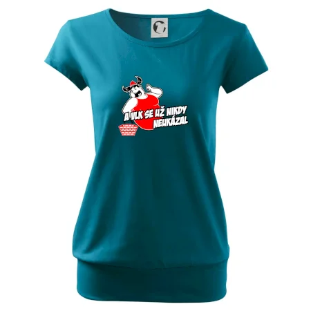 Trendové dámské triko s velmi krátkým rukávem, volnějšího střihu, v dolním kraji všité do širokého lemu. Kulatý průkrčník s úzkým lemem ze shodného materiálu.