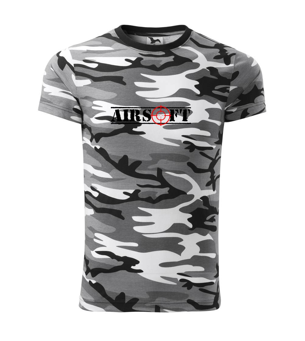 Tričko střední gramáže v barvách camouflage. Střih s bočními švy. Lem průkrčníku ze žebrového úpletu s přídavkem 5 % elastanu. Vnitřní část zadního průkrčníku začištěna páskou v barvě camouflage.