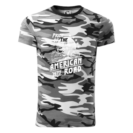 Tričko střední gramáže v barvách camouflage. Střih s bočními švy. Lem průkrčníku ze žebrového úpletu s přídavkem 5 % elastanu. Vnitřní část zadního průkrčníku začištěna páskou v barvě camouflage.