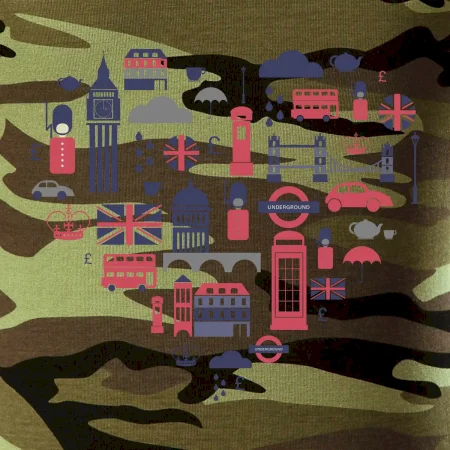 Tričko střední gramáže v barvách camouflage. Střih s bočními švy. Lem průkrčníku ze žebrového úpletu s přídavkem 5 % elastanu. Vnitřní část zadního průkrčníku začištěna páskou v barvě camouflage.