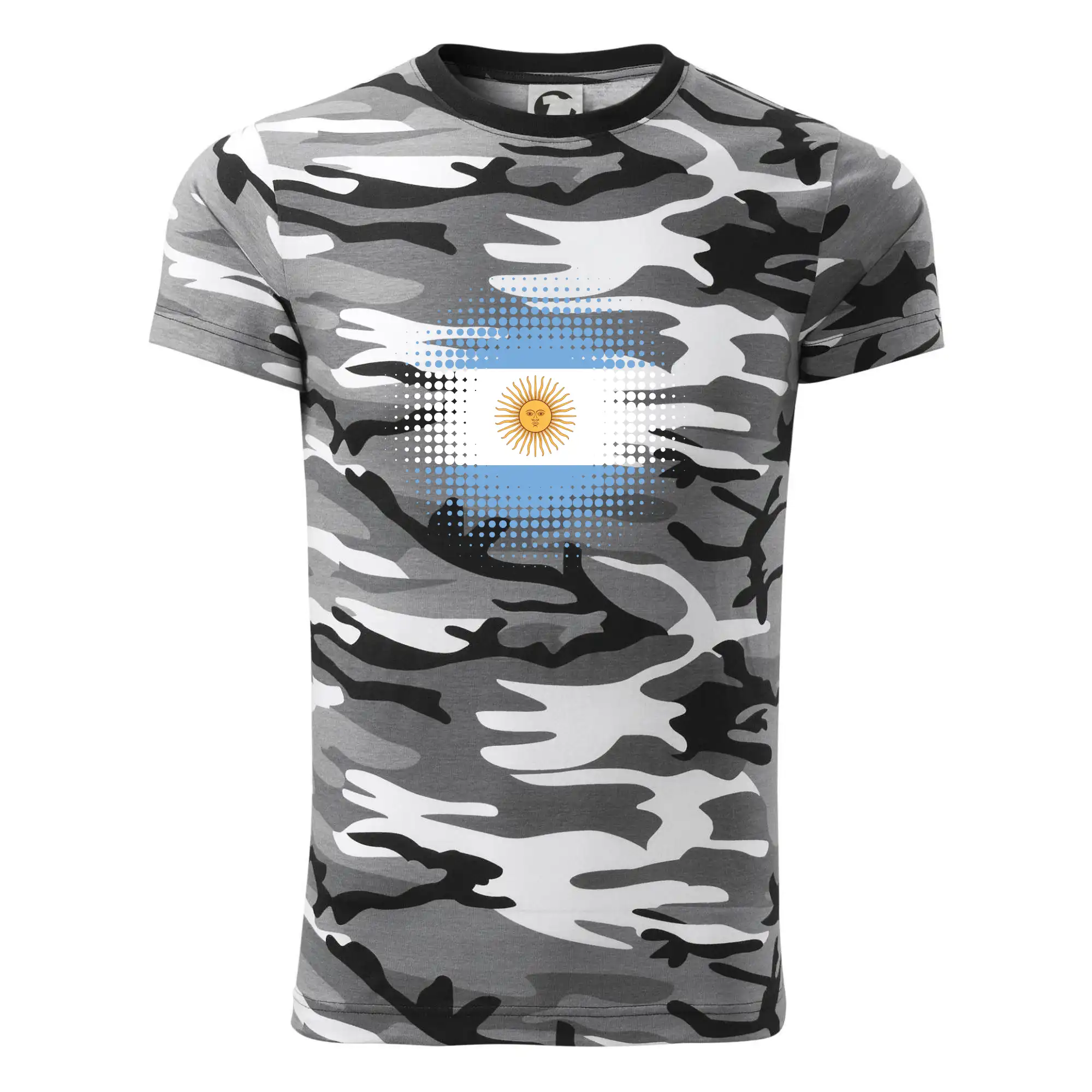 Tričko střední gramáže v barvách camouflage. Střih s bočními švy. Lem průkrčníku ze žebrového úpletu s přídavkem 5 % elastanu. Vnitřní část zadního průkrčníku začištěna páskou v barvě camouflage.
