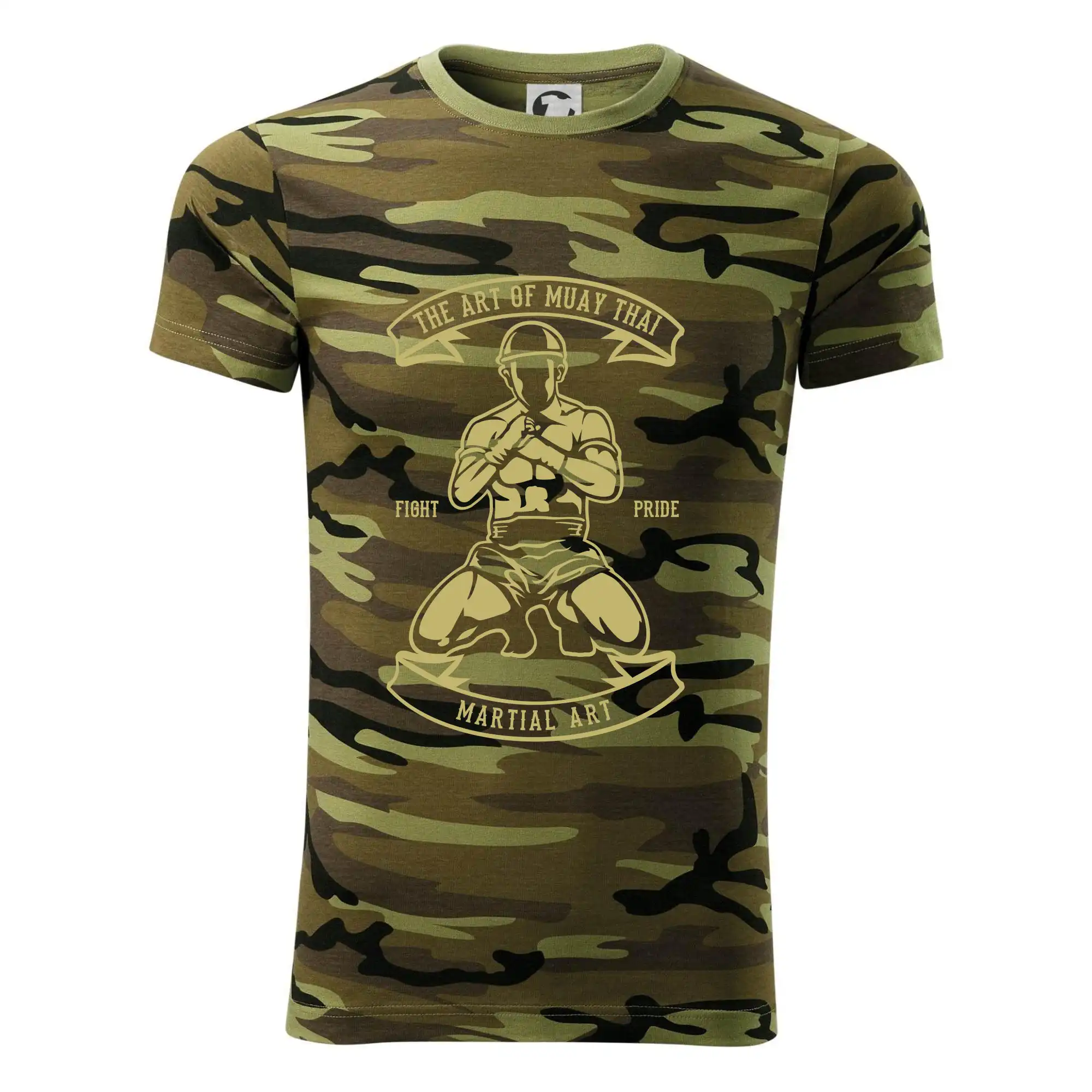 Tričko střední gramáže v barvách camouflage. Střih s bočními švy. Lem průkrčníku ze žebrového úpletu s přídavkem 5 % elastanu. Vnitřní část zadního průkrčníku začištěna páskou v barvě camouflage.